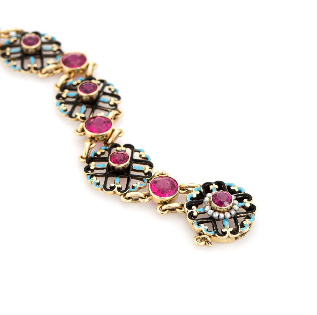 The bracelet is in good original condition with some loss to the enamel. We have not cleaned it in order to preserve the patina and collector value.