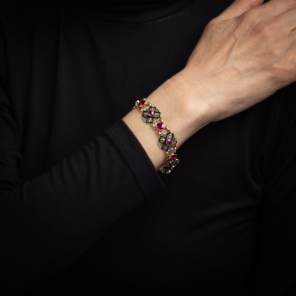 The bracelet measures 6 inches in length and is designed for a smaller wrist (please check your wrist size prior to purchase). Created rubies are set into beautifully detailed scrolled mounts. Blue and black enamel adds a pop of color, offering a striking and unique contrast to the rubies. An attractive piece to wear alone or layered with your other fine bracelets. We have the entire suite of jewelry available including the matching ring, necklace and earrings.