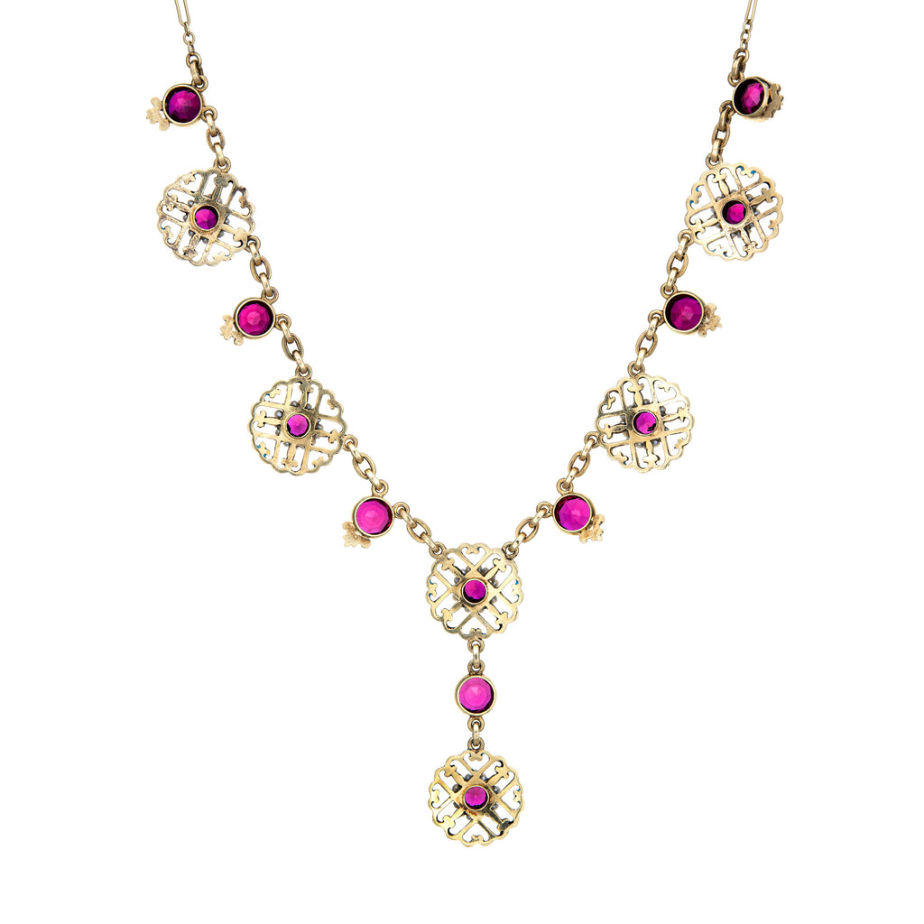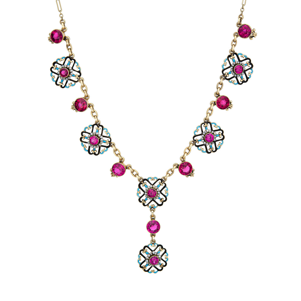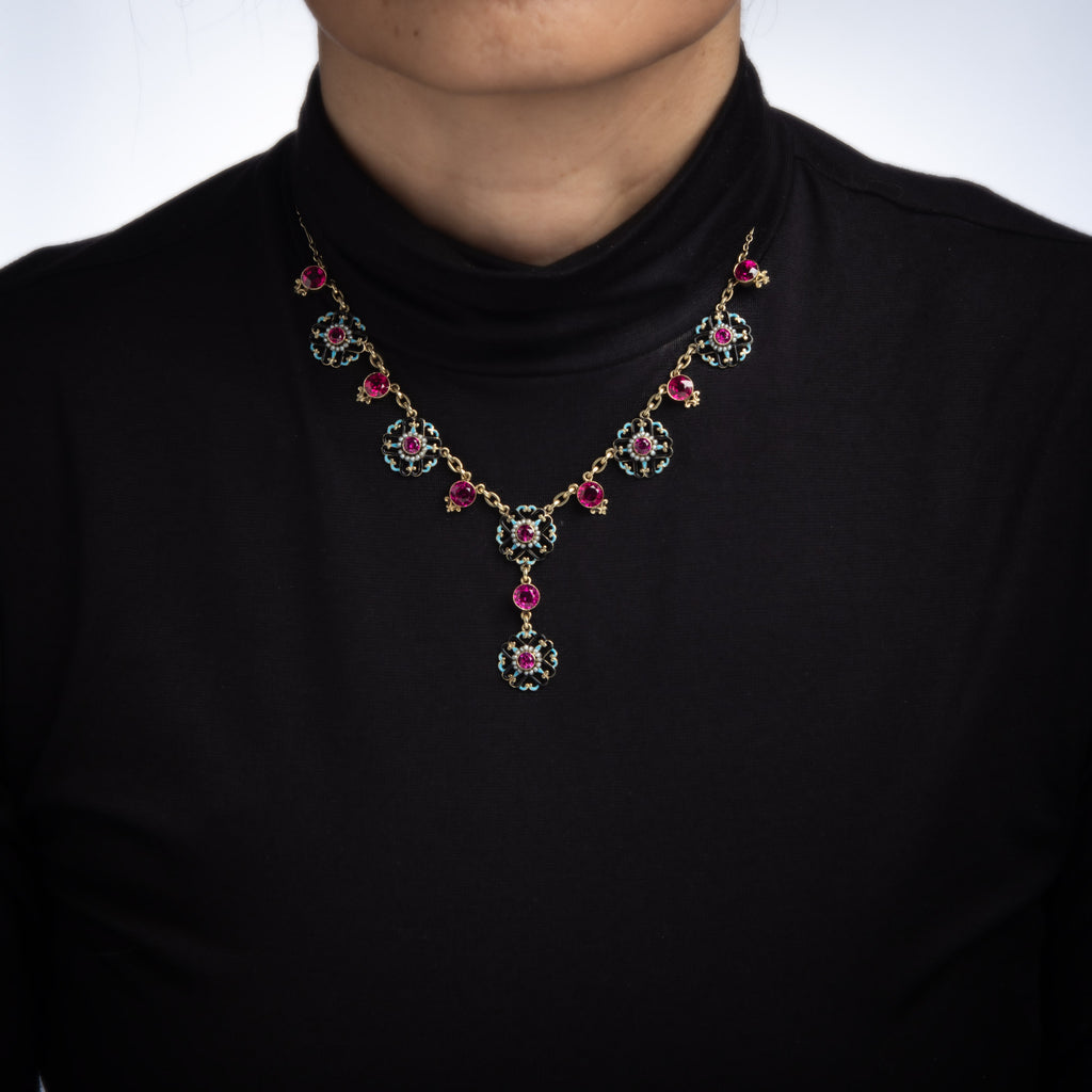 The necklace measures 16 inches in length with a 1 3/4 inch drop. Created rubies are set into beautifully detailed scrolled mounts. Blue and black enamel adds a pop of color, offering contrast to the rubies that is striking and unique. An attractive piece to wear alone or layered with your other fine necklaces. We have the entire suite of jewelry available including the matching ring, bracelet and earrings.