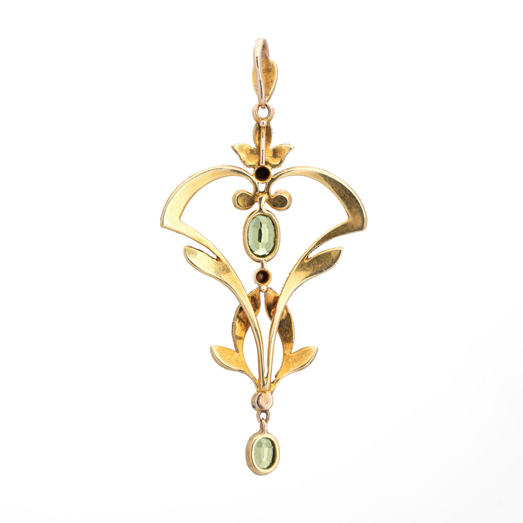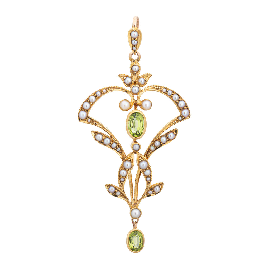 Antique Edwardian Lavalier Pendant Peridot Seed Pearls Vintage 18k Yellow Gold