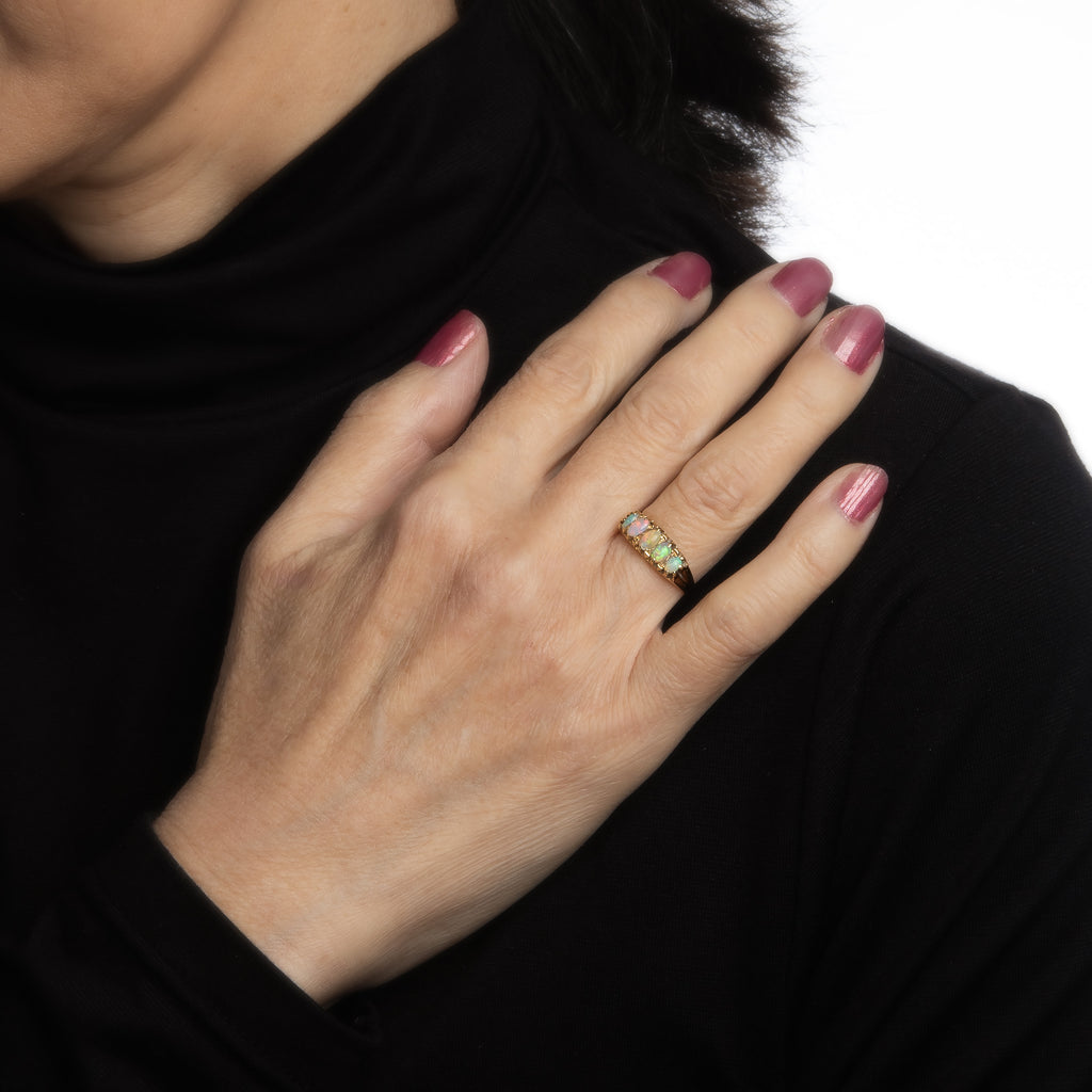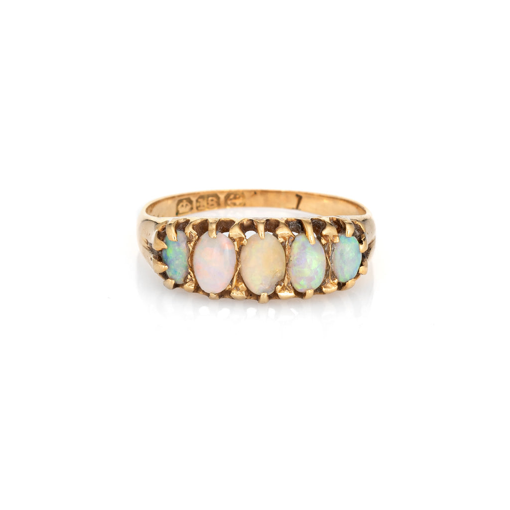 Antique Edwardian 5 stone opal ring (circa 1910s), crafted in 18 karat yellow gold.