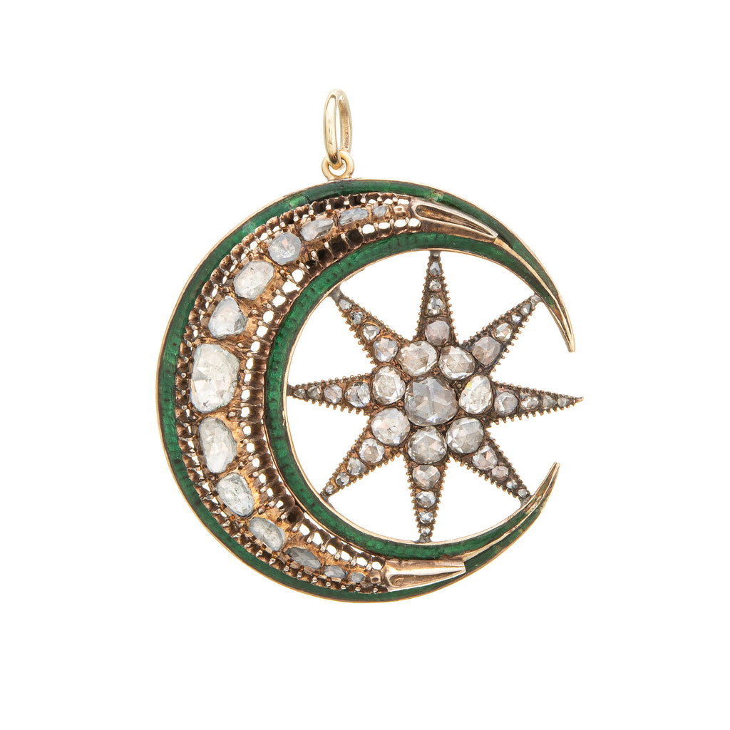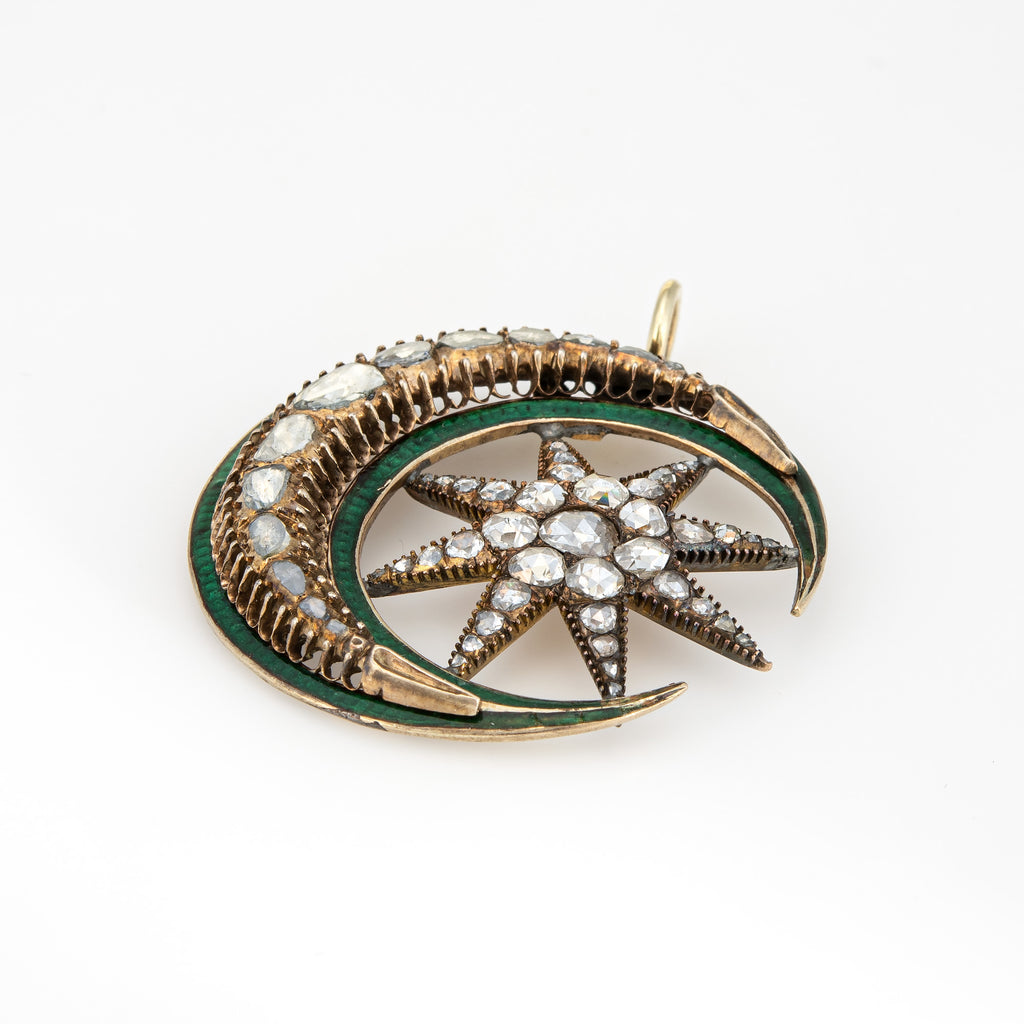 Set into a classic crescent moon motif with a star motif to the center, the old rose cut diamonds glimmer and are arranged to create a celestial effect, evoking a shimmering night sky. Originally a brooch, we removed the pin closure and added a bale for wear as a pendant. Framed with green enamel the pendant is a special and timeless piece of antique jewelry.