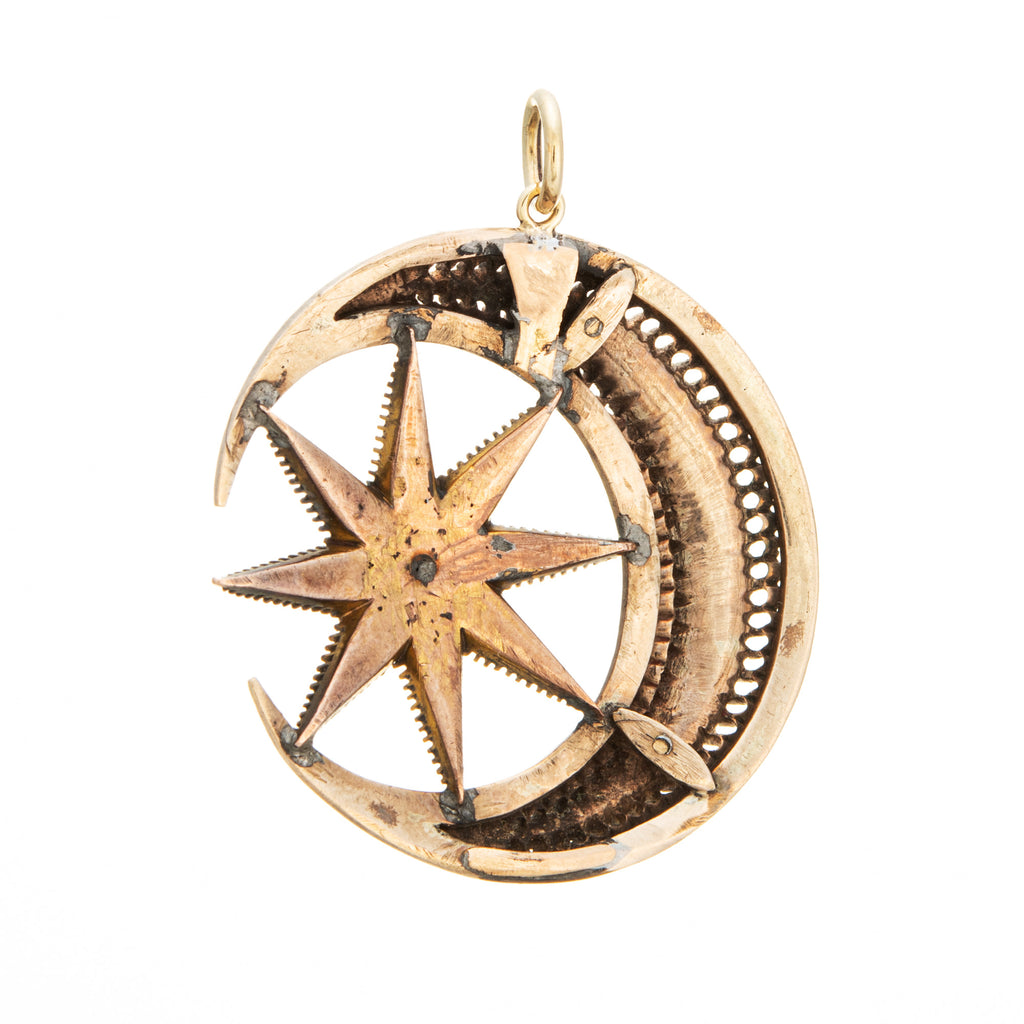 Elaborate antique Victorian diamond crescent moon pendant (circa 1880s to 1900s) crafted in 14 karat yellow gold.