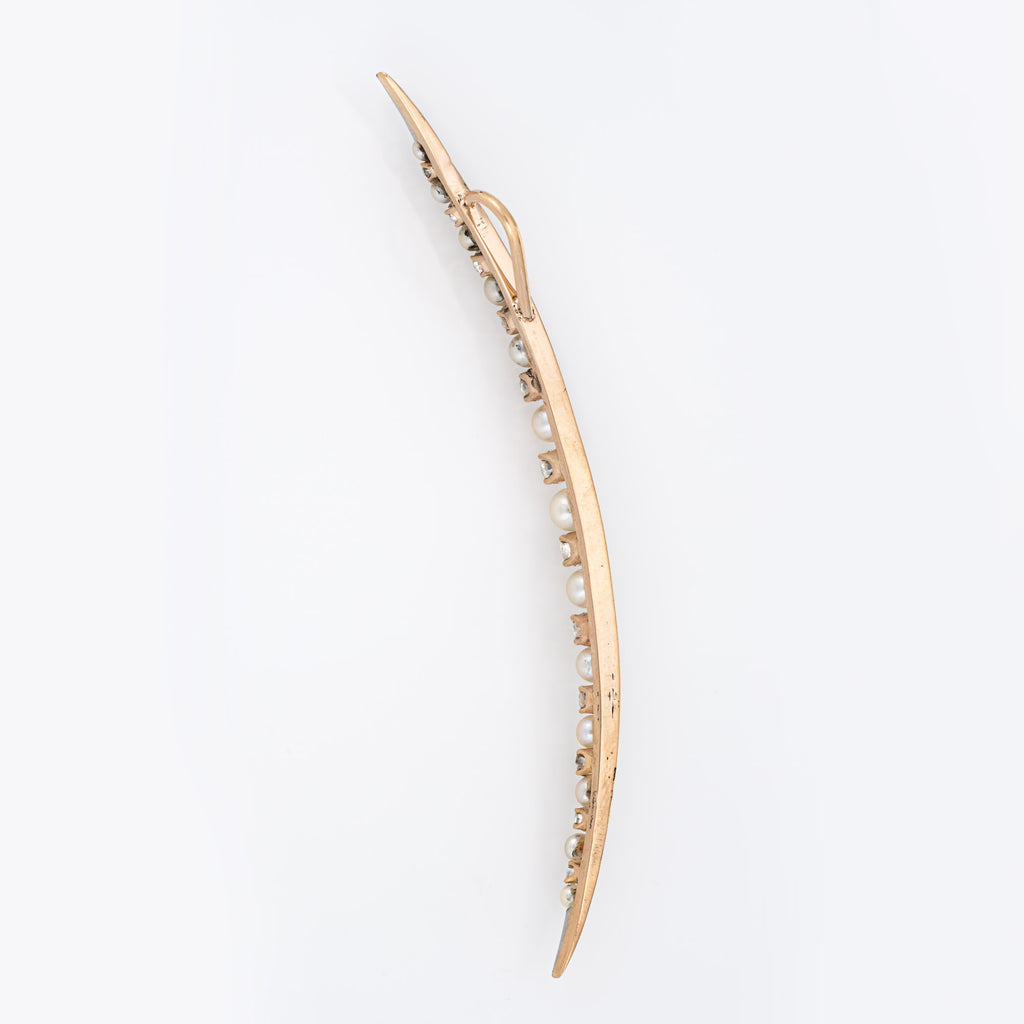 Stones: 12 old mine cut diamonds range in size from 0.03 to 0.20 carats and total an estimated 0.75 carats (estimated at H-I color and SI1-I1 clarity). 13 pearls range in size from 2mm to 3mm.
