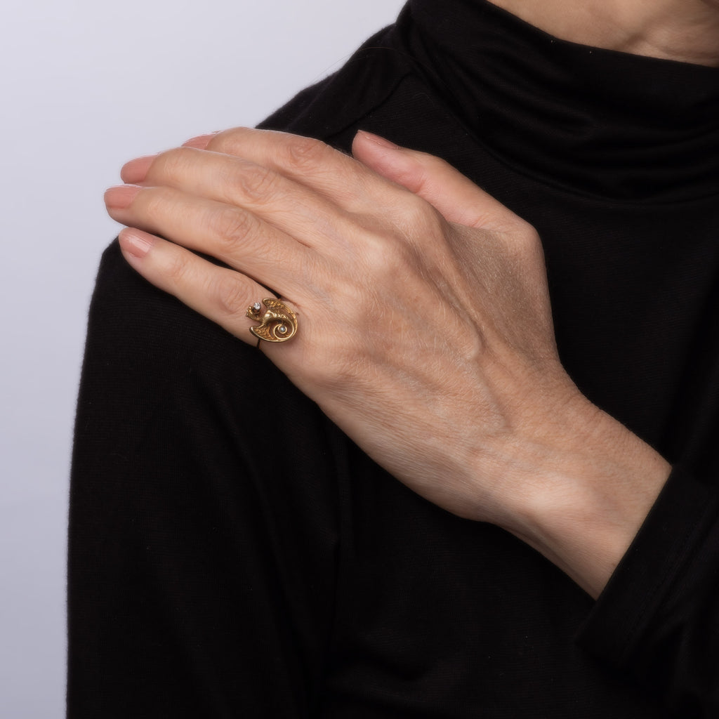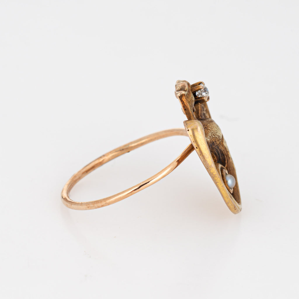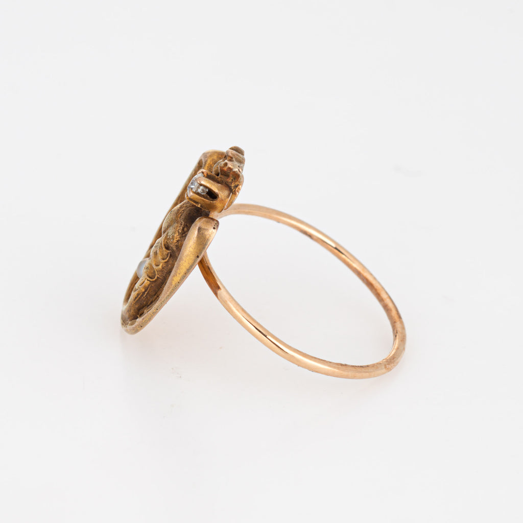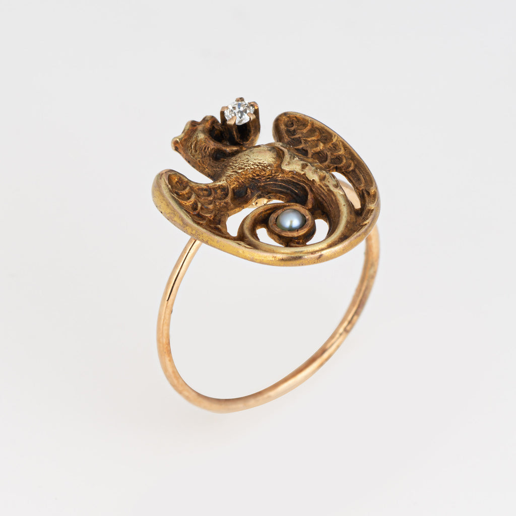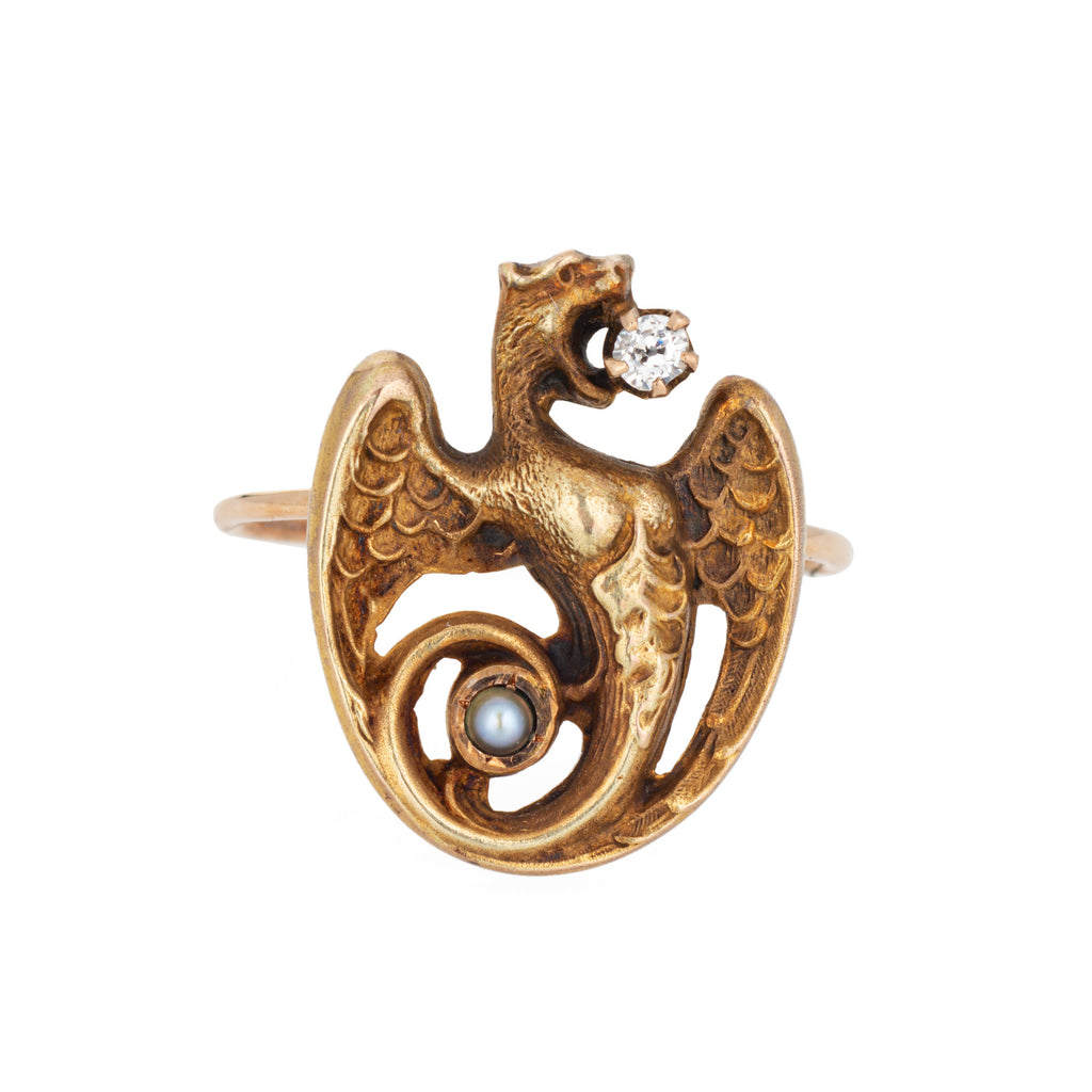 The ring is mounted with the original stick pin. Our jeweler rounded the stick pin into a slim band for the finger. The beautifully detailed ring is set with an estimated 0.03 carat old mine cut diamond (estimated at I-J color and SI2 clarity) and a 1mm seed pearl. The griffin or dragon with open wings is set with a diamond to the mouth and a small seed pearl to the coiled base. The dragon was a popular motif in antique jewelry around the turn of the 20th century, a symbol of courage and strength.