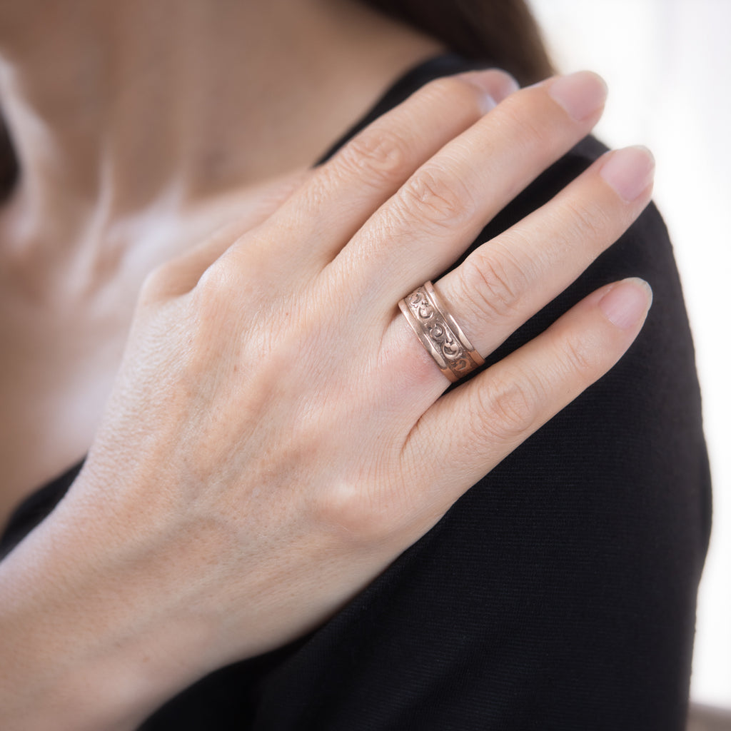 Charming embossed foliate pattern is embossed around the band.