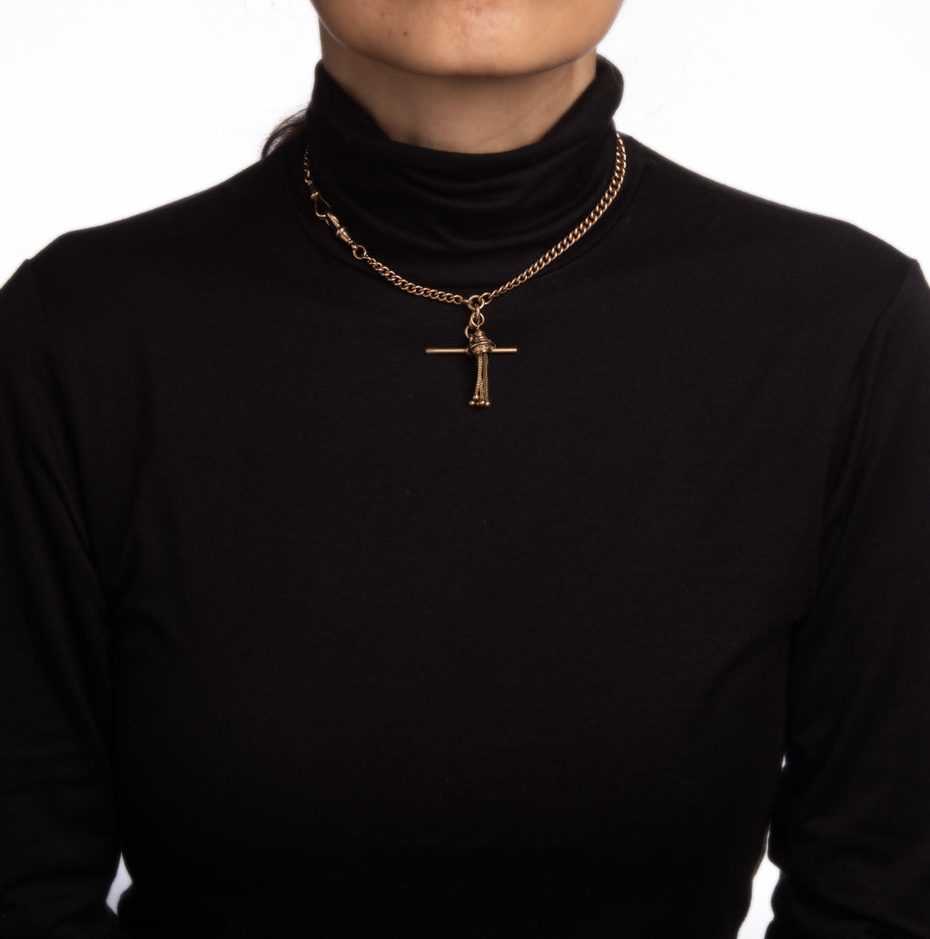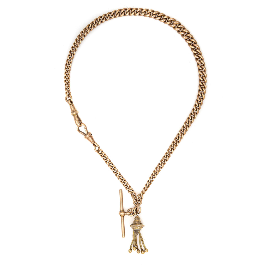 The hefty curb link necklace weighs 34.7 grams and features graduated links, tapering from smaller 4mm links to wider 6.5mm links to the center in rosy 9k gold. English in origin, the necklace has an attached T bar and tassel. The 14-inch chain is great for wear alone or layered with your fine jewelry from any era. The necklace is short in length, and we encourage you to measure your neck prior to purchase.