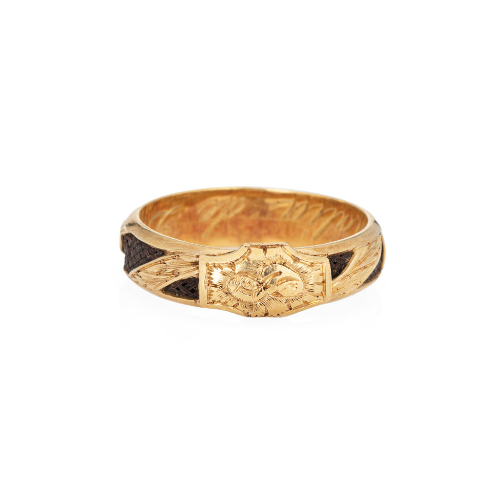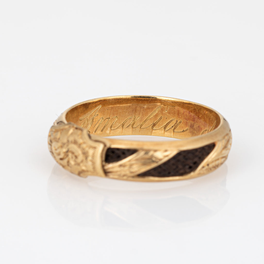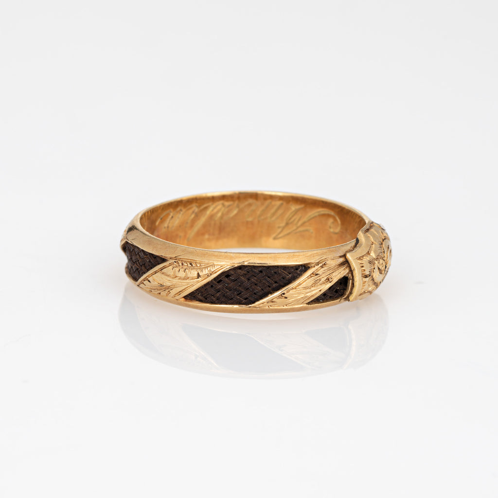 In the Victorian era, hair jewelry held immense sentimental value and served as a unique and poignant form of remembrance and mourning. The ring has intricately braided hair embedded into the band and around the entire circumference of the ring. Hair jewelry was a deeply personal and intimate memento symbolizing the eternal connection between the living and the departed. Hair jewelry today if sought after by collectors for their tangible links to a bygone era of remembrance and expression. The band has a low profile, rising 3mm from the finger (0.11 inches) and sits comfortably on the finger. The ring is a larger size (US 10) and is unfortunately not sizable. The inner band is engraved 'Amalia de Diliz'