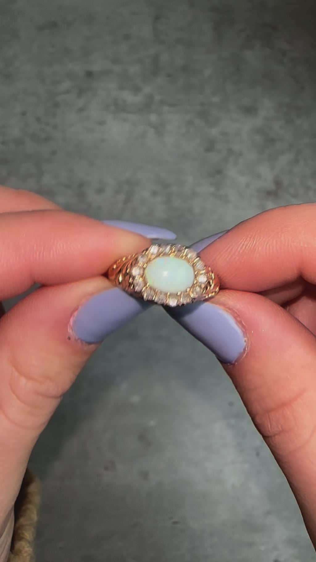 Set in an east to west design, the opal is surrounded with old rose cut diamonds that offer a subtle shimmer. Intricate etched foliate details adorn the side shoulders. The ring has a low profile and rises 6mm from the finger (0.23 inches).