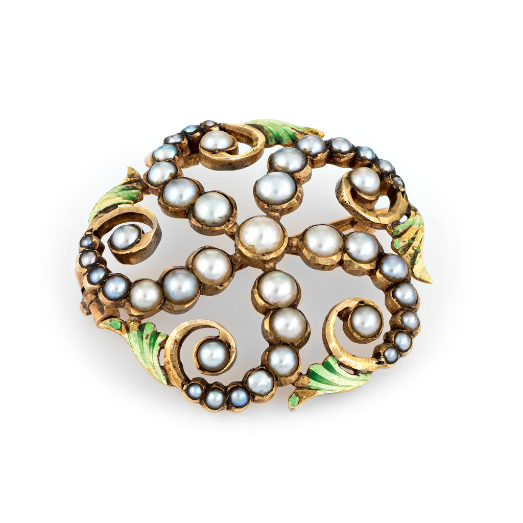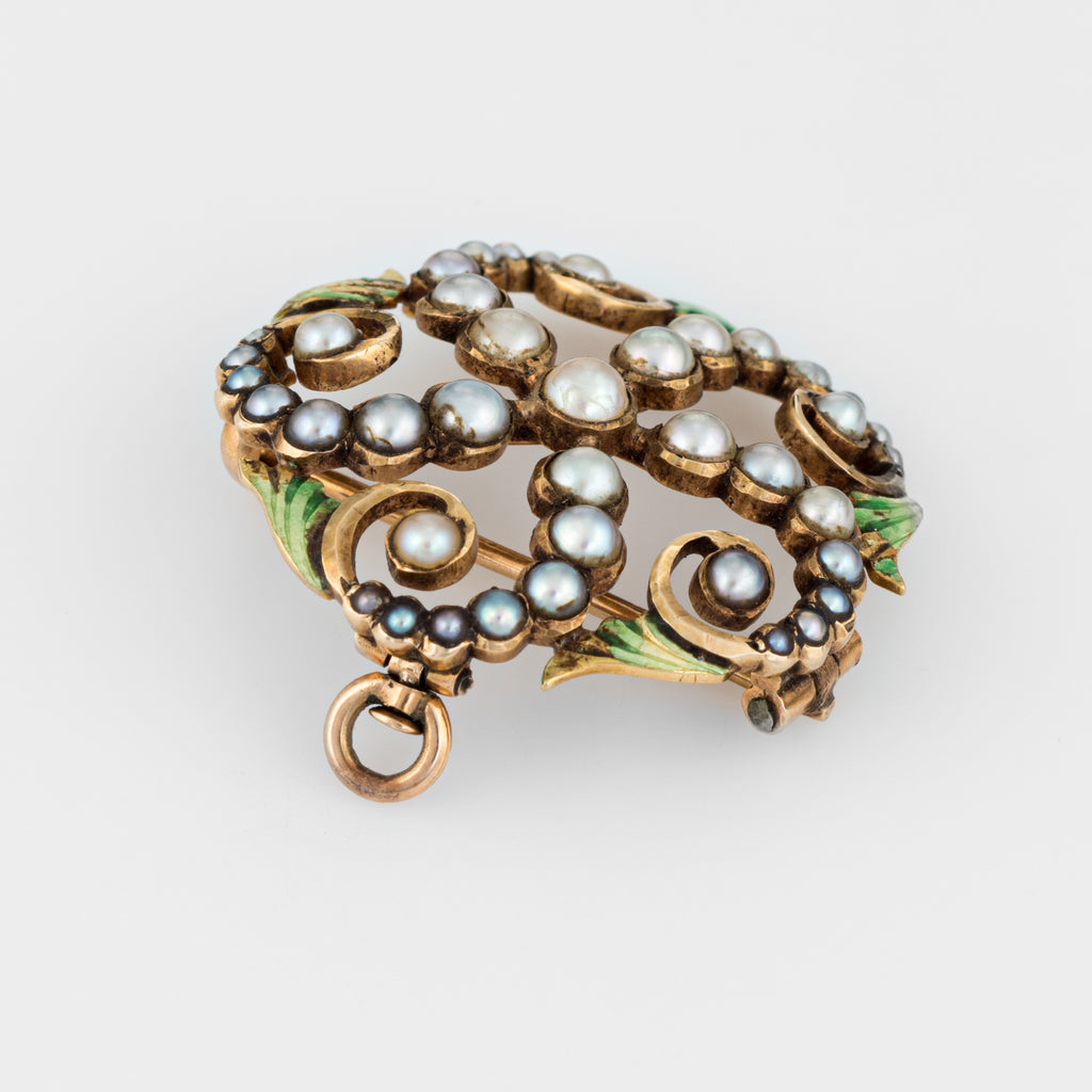 Seed pearls ranging in size from 1mm to 2.5mm. The pearls appear to be original to the piece with some graduation in color evident. Green enameled leaves accent the seed pearls. Note: slight loss to the enamel.