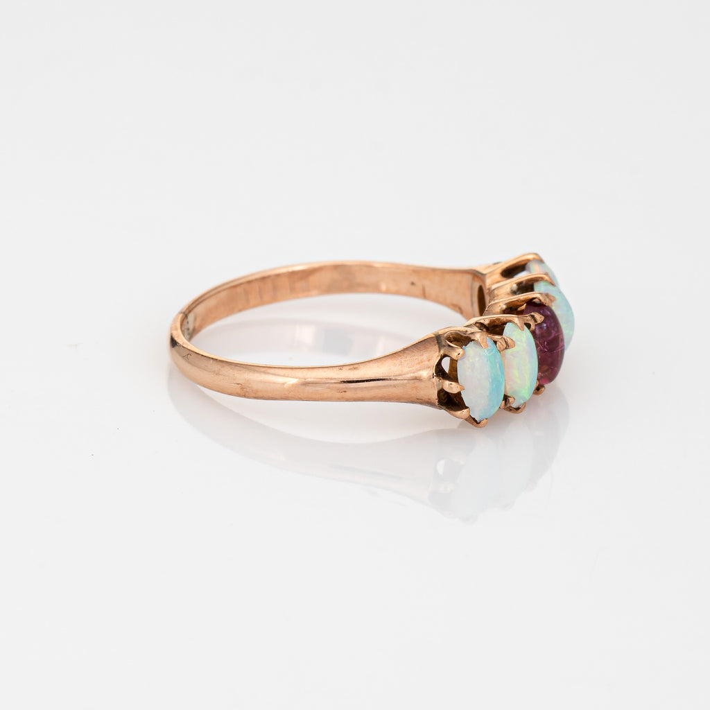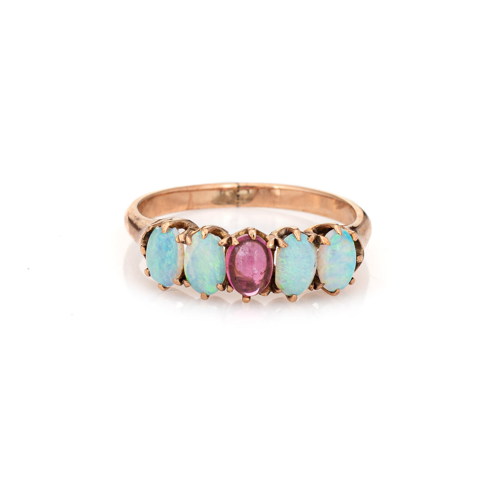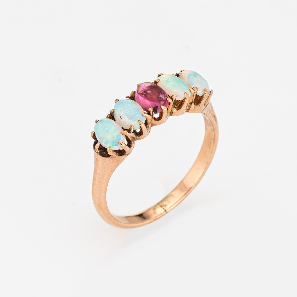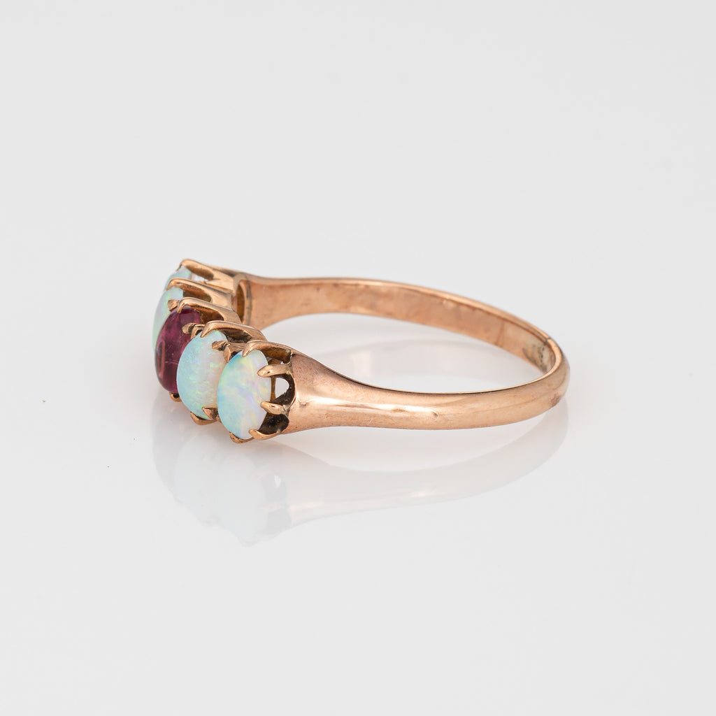 Elegant antique Victorian ring (circa 1880s to 1900s), crafted in 10 karat rose gold. Four opals are estimated at 0.20 carats each (0.80 carats total estimated weight), accented with one estimated 0.20 carat cabochon cut pink tourmaline. The pink tourmaline is a later addition to the ring. The stones are in very good condition and free of cracks or chips.