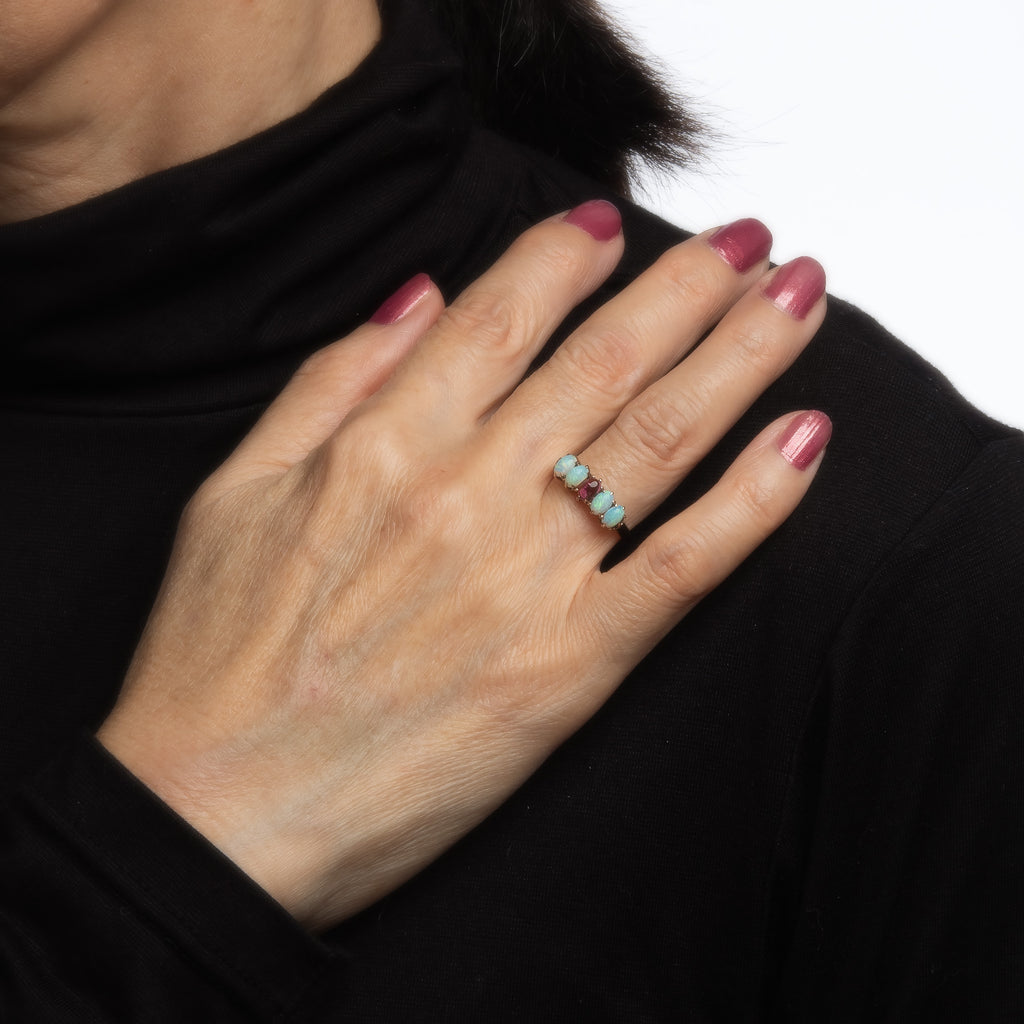 The five stone band features natural opals with a strong blue/green color matrix. The pink tourmaline adds a nice pop of color to the ring. The band is great worn alone or layered with your fine jewelry from any era.