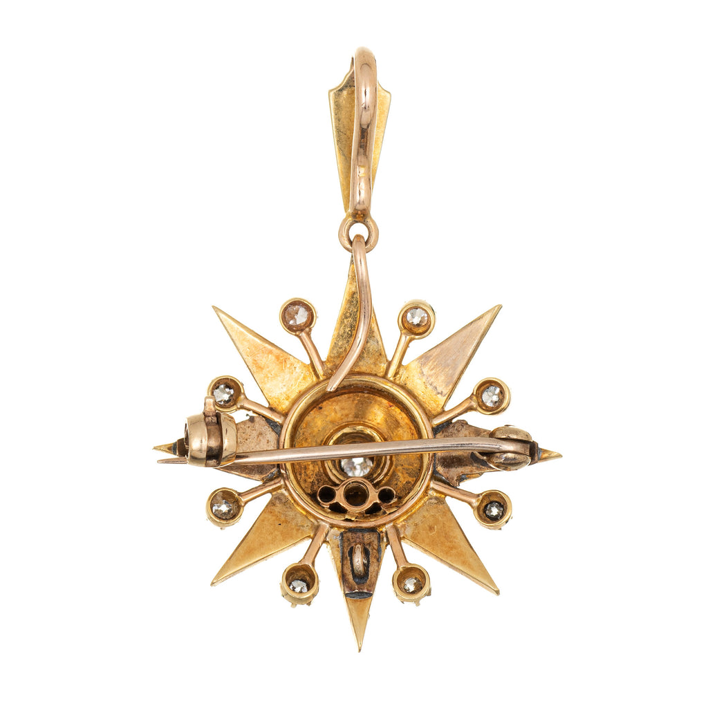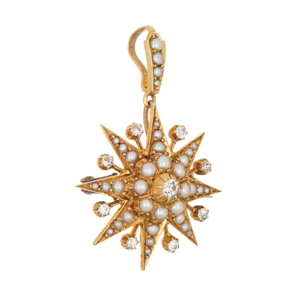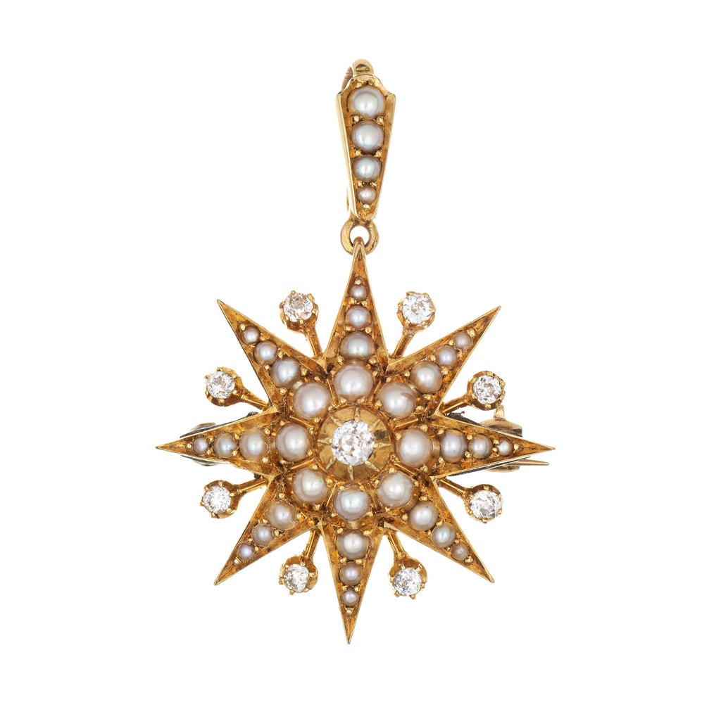 The beautifully detailed pendant features an elaborate starburst design, set with lustrous seed pearls and shimmering old mine cut diamonds. The versatile piece can be worn as a pendant or a brooch. The pendant is a wonderful and unique example of jewelry from the late Victorian era when celestial themed jewelry was all the rage.