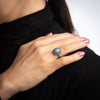 The turquoise is surrounded with a double halo of rose cut diamonds that offer a soft and subtle shimmer. The low rise ring (6.5mm - 0.25 inches) sits nicely on the finger. Ideal worn as an alternative engagement ring or a right hand ring for everyday wear.