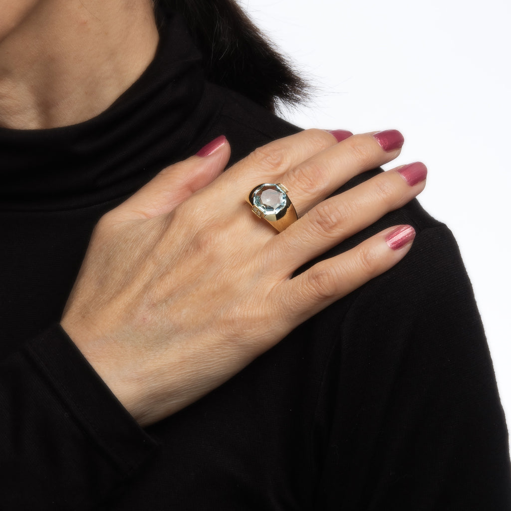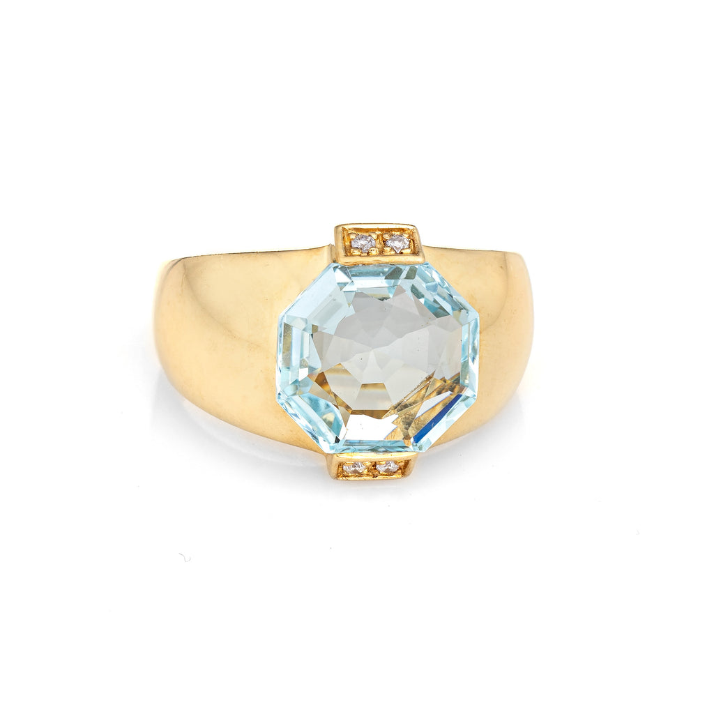 The clear as sky blue aquamarine is cut in a unique hexagonal shape, with step faceting to allow for beautiful sparkle and fire from the gemstone. Set into a wide gypsy style band (15.5mm - 0.61 inches), the ring has a curved saddle for a comfortable fit on the finger. The band has a low rise from the finger (7mm - 0.27 inches). Great for day to evening wear.
