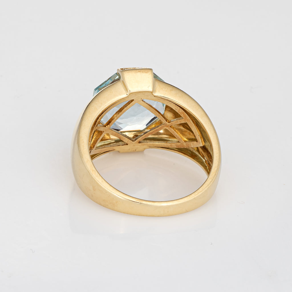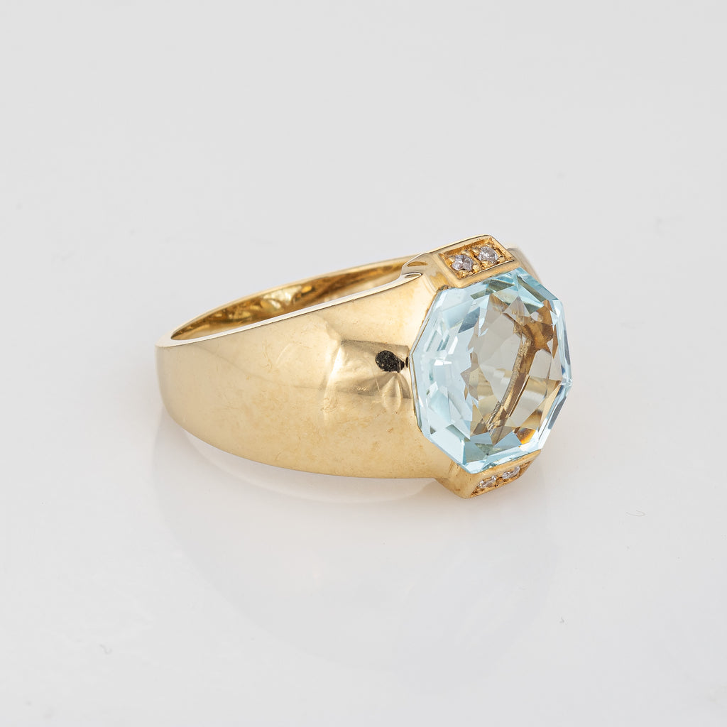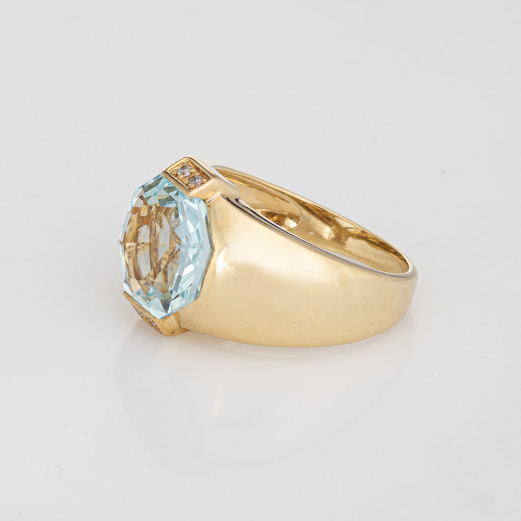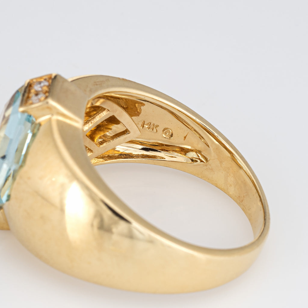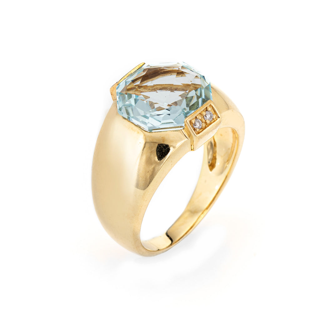 Stylish vintage aquamarine & diamond gypsy ring (circa 1980s to 1990s) crafted in 14 karat yellow gold.