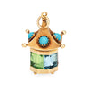 The ornate charm is set with colorful gemstones in a temple themed mount. The piece can be worn as a charm on a bracelet or as a pendant on a chain.
