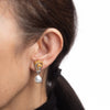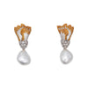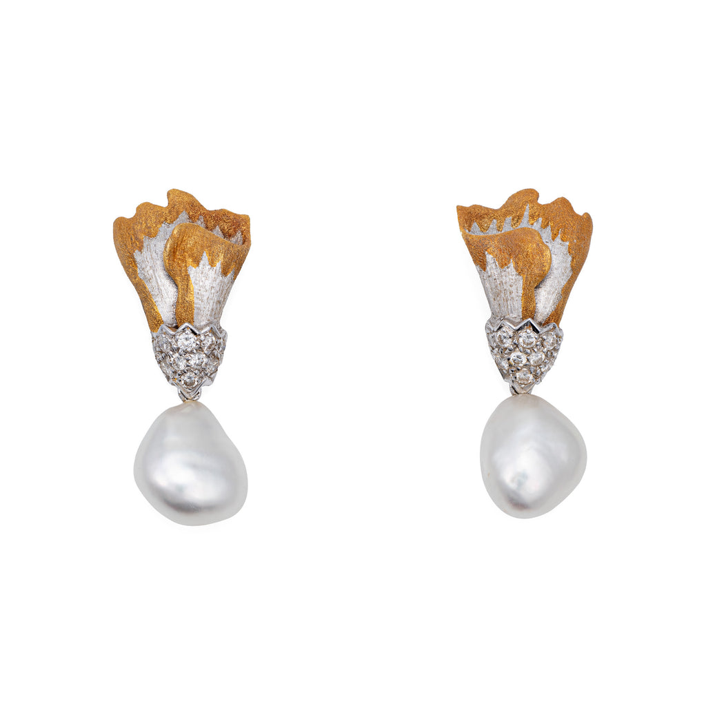 The elegant drops are set with lustrous baroque pearls and diamonds to the base of the mounts. The striking earrings feature a brushed gold finish in white and yellow gold. The earrings are great for day or evening wear & fitted with post & butterfly backings.