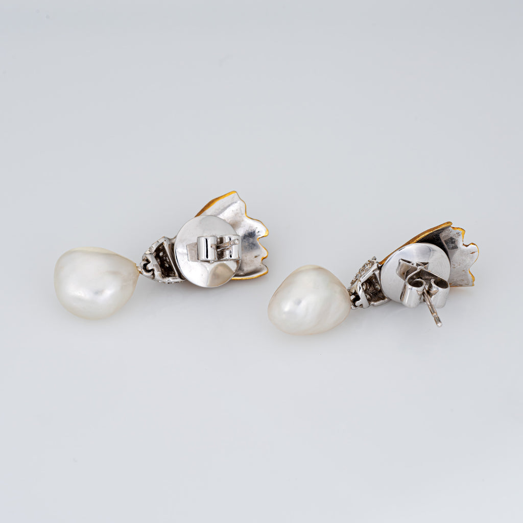 Elegant pair of vintage baroque pearl & diamond drop earrings crafted in 18k yellow & white gold (circa 1990s).
