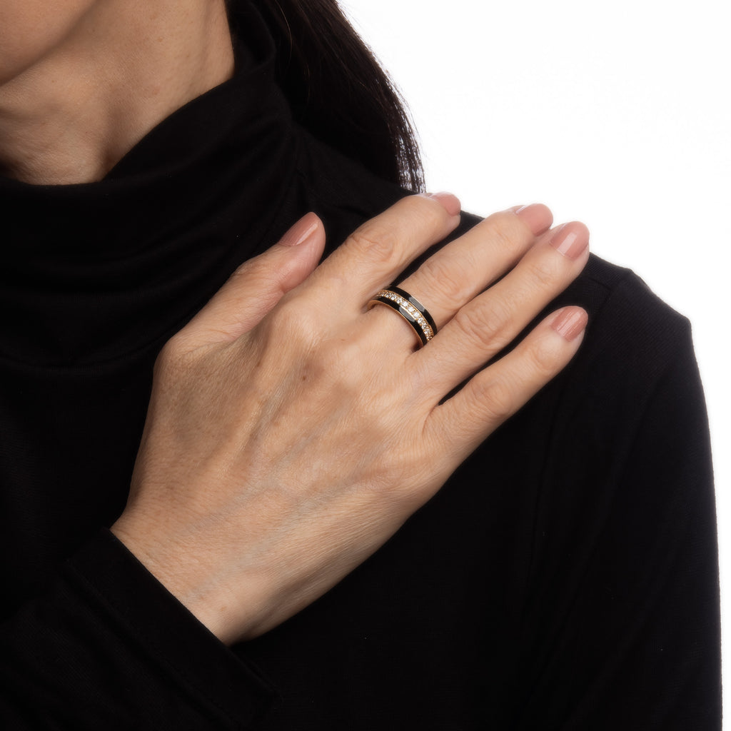 With a strand of diamonds to the center and framed with black enamel on both sides of the band, the ring is great worn alone or stacked with your fine jewelry from any era. The band sits flat on the finger, rising 1.5mm (0.05 inches).