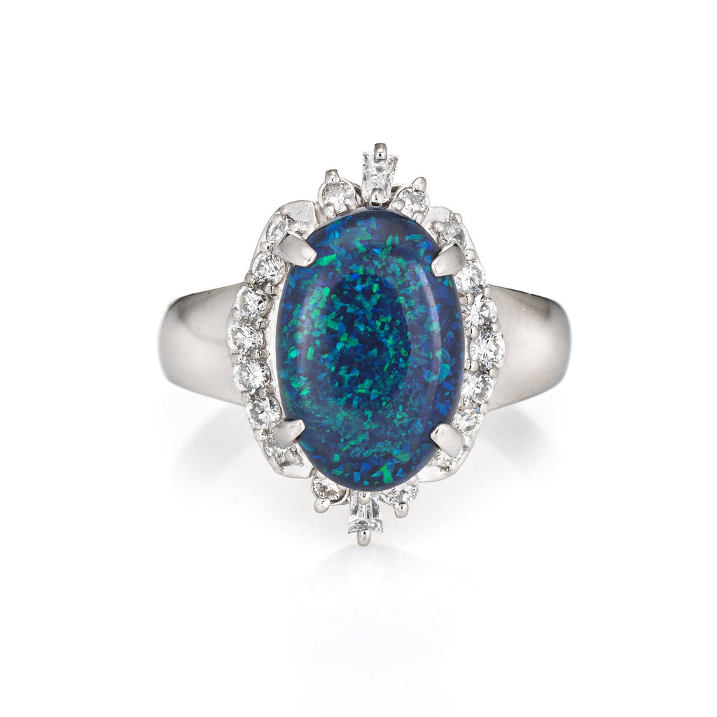 Stones: Cabochon cut natural black opal measures 13mm x 8.5mm (estimated at 2.10 carats), accented with 0.42 carats of diamonds (estimated at H-I color and VS1-2 clarity). The opal is in very good condition and free of cracks or chips.