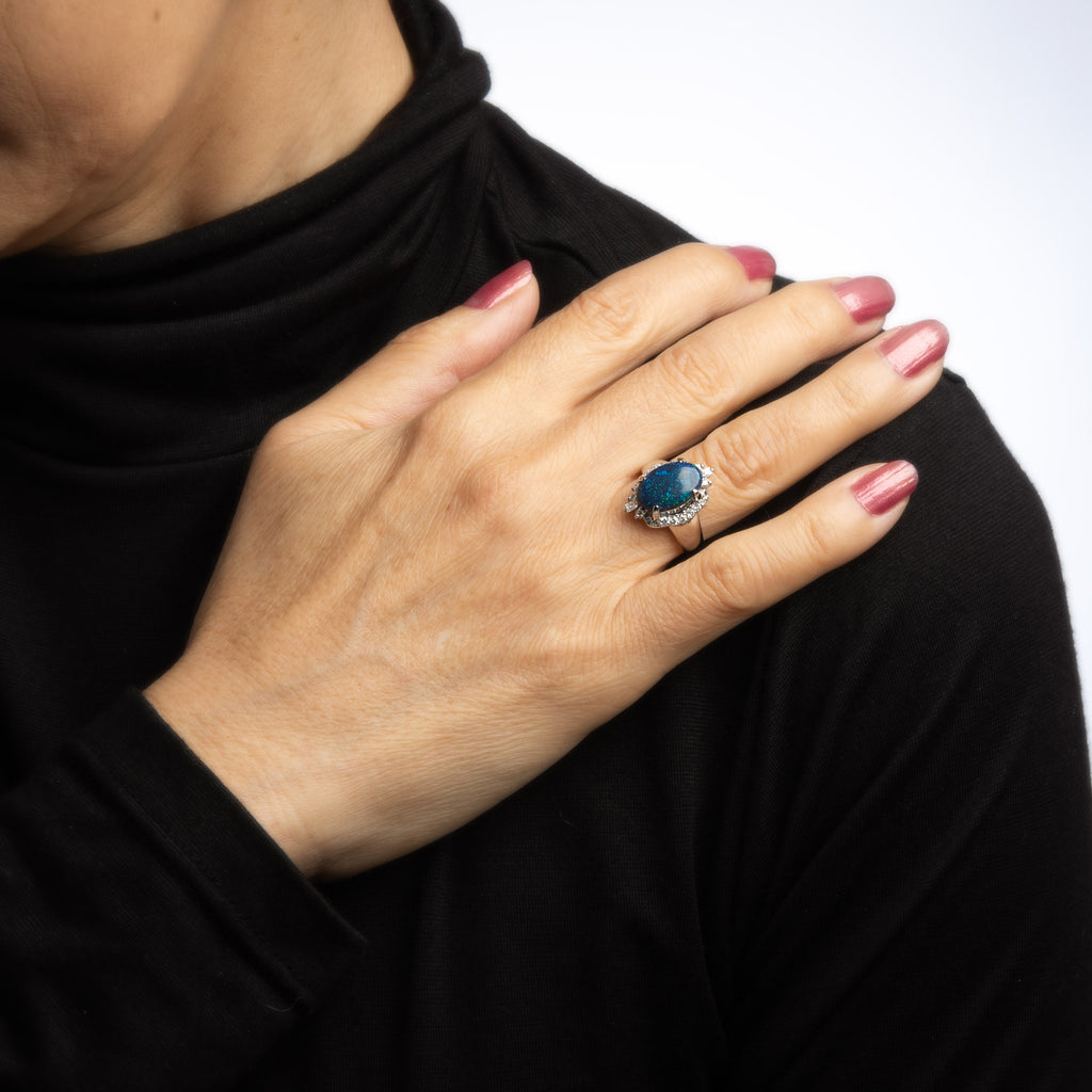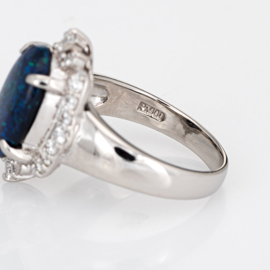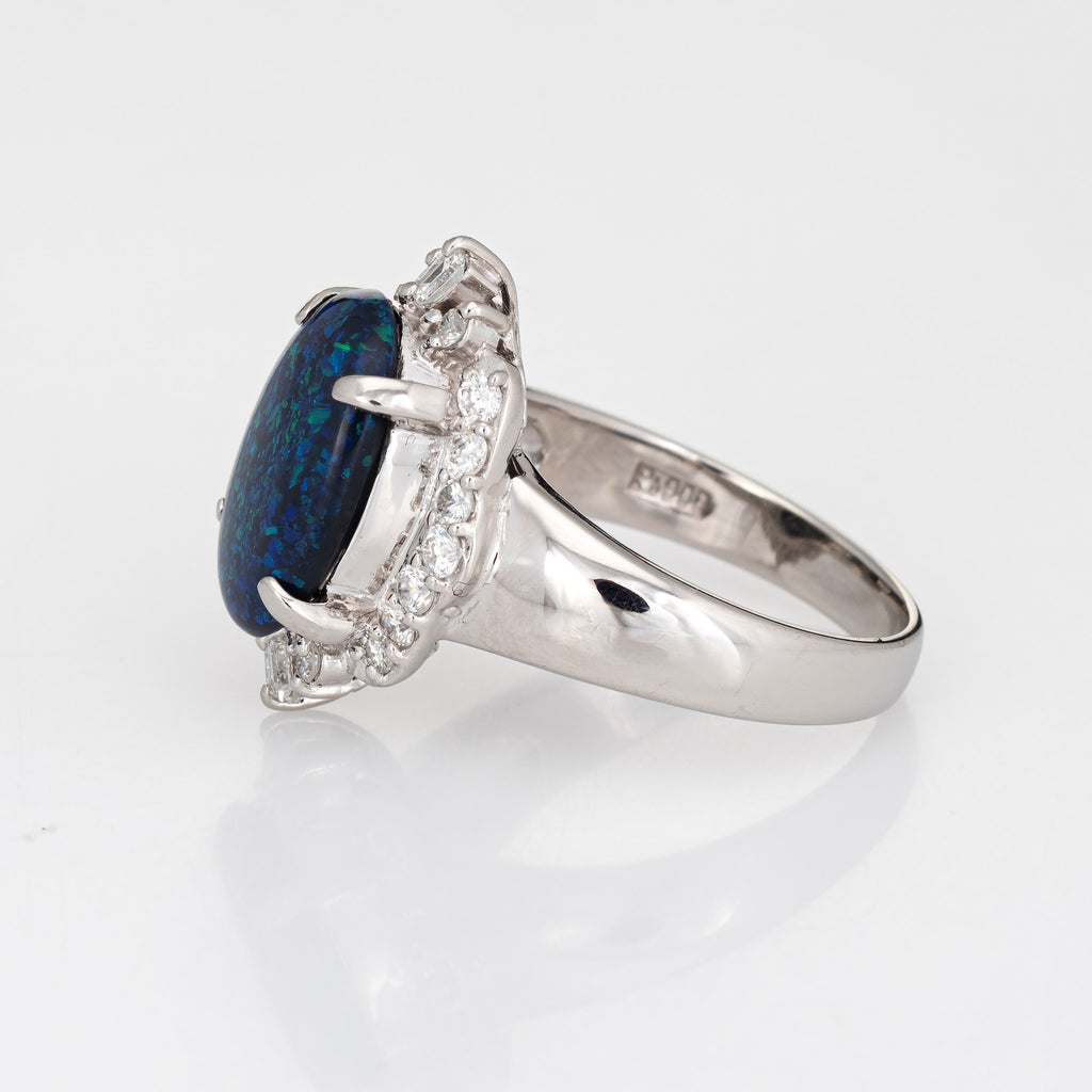 Stylish black opal & diamond cocktail ring crafted in 900 platinum.