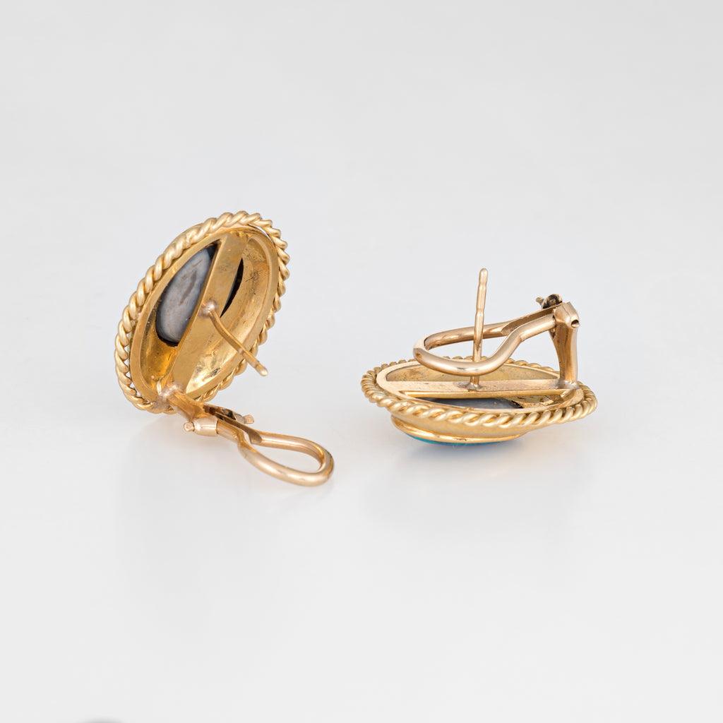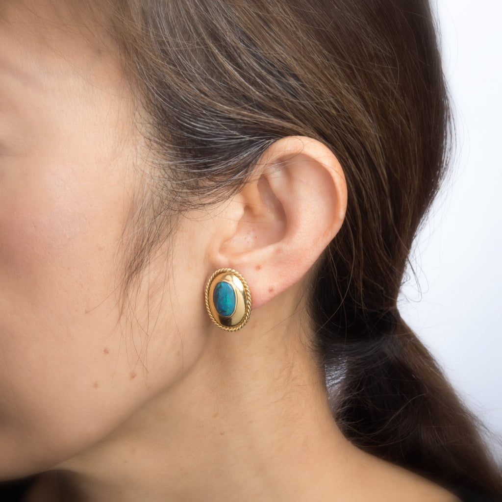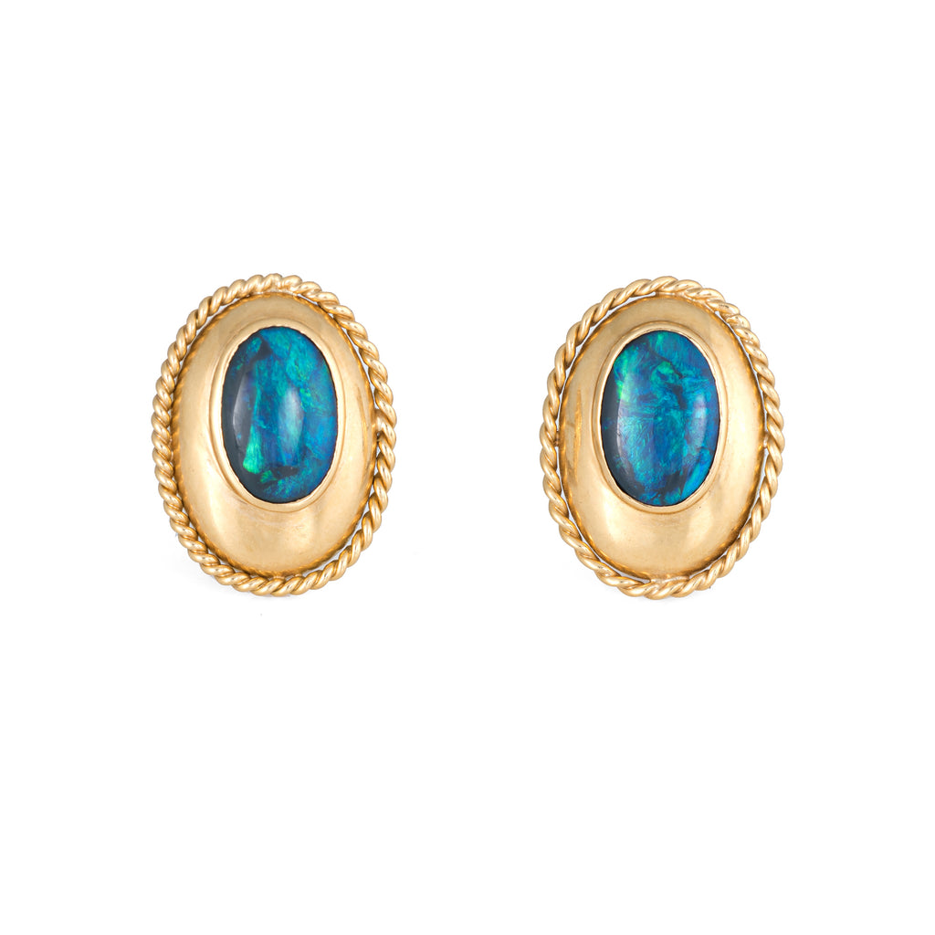 Finely detailed pair of vintage black opal earrings crafted in 14k yellow gold.