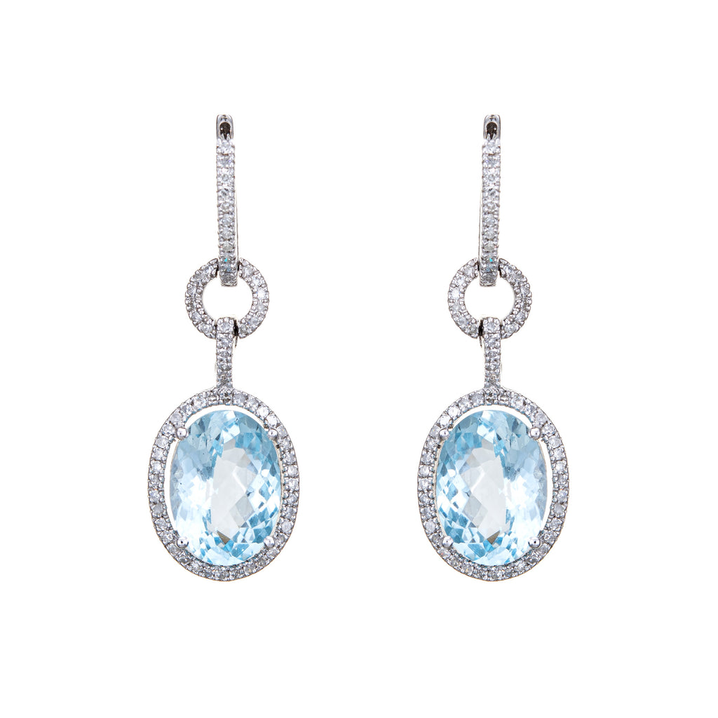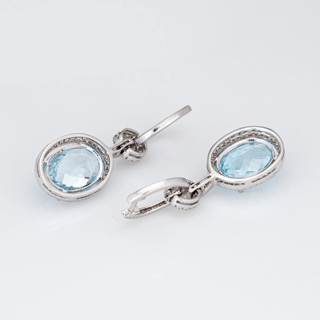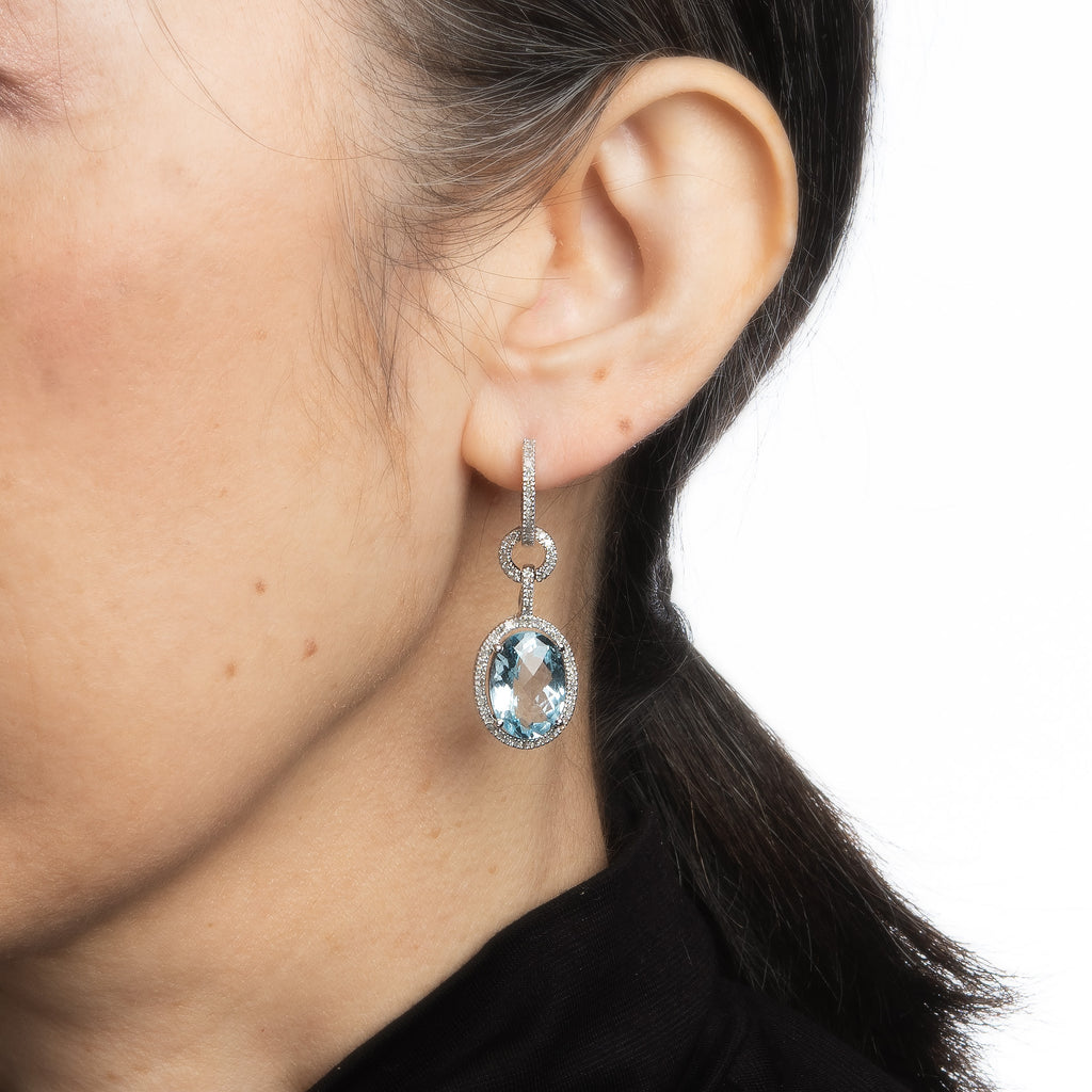 Elegant pair of blue topaz & diamond drop earrings crafted in 14k white gold.