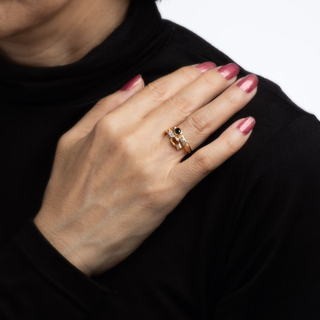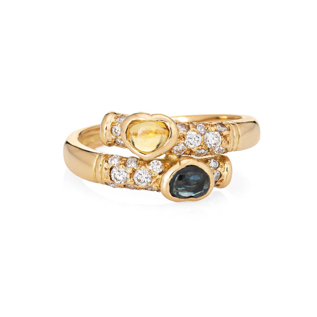 The cabochon cut blue and yellow sapphires are set into romantic heart shaped mounts in a bypass design. The band is great worn alone or stacked with your fine jewelry from any era. The low rise ring (4mm - 0.15 inches) sits comfortably on the finger.