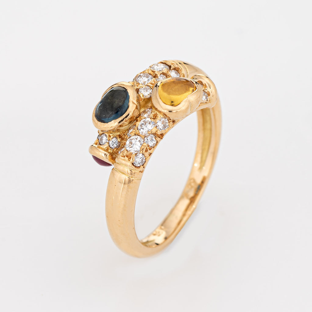 Cabochon cut yellow and blue sapphires are estimated at 0.50 carats each. Two cabochon cut rubies are estimated at 0.10 carats each. The diamonds total an estimated 0.25 carats (estimated at H-I color and VS2-SI1 clarity).