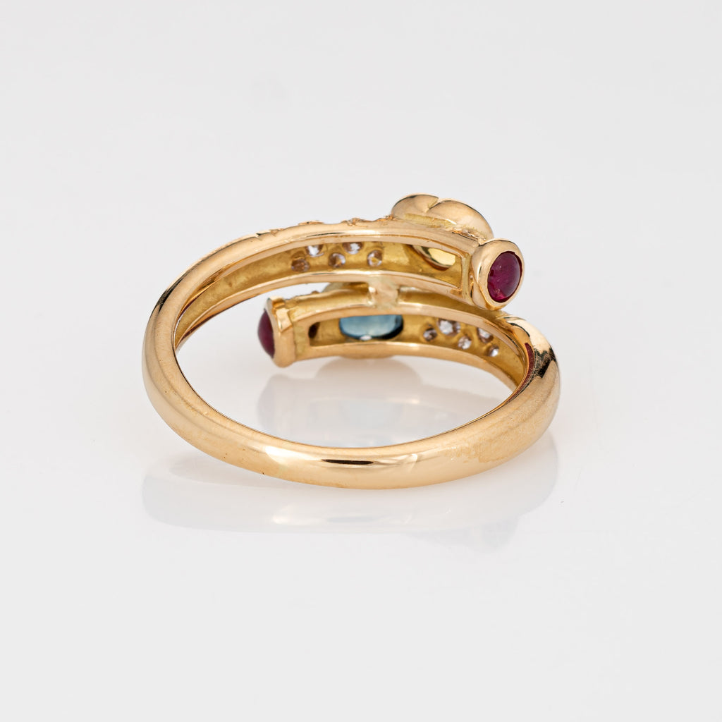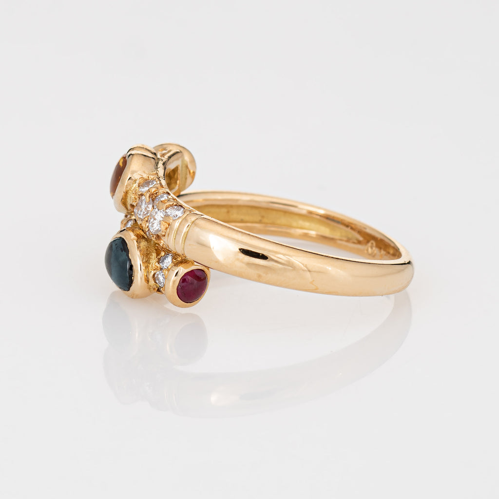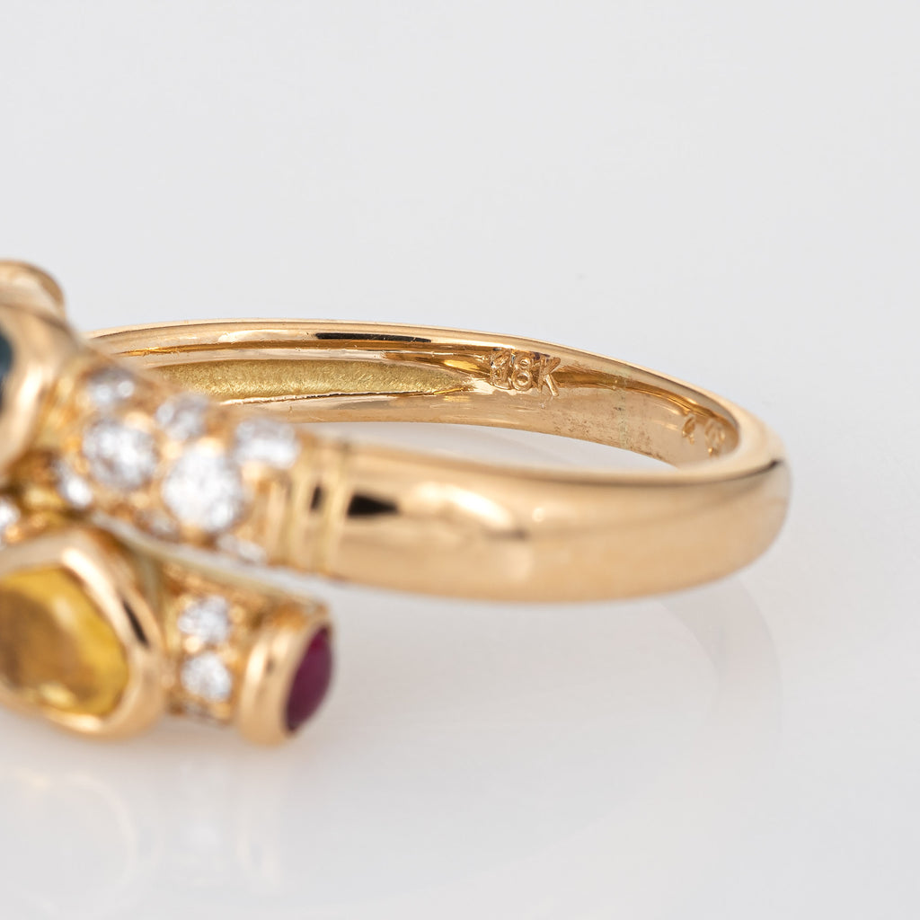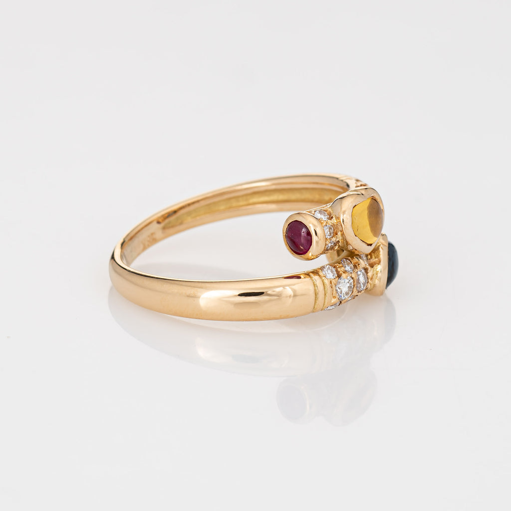 Stylish vintage colored sapphire & diamond bypass ring (circa 1980s to 1990s) crafted in 18 karat yellow gold.