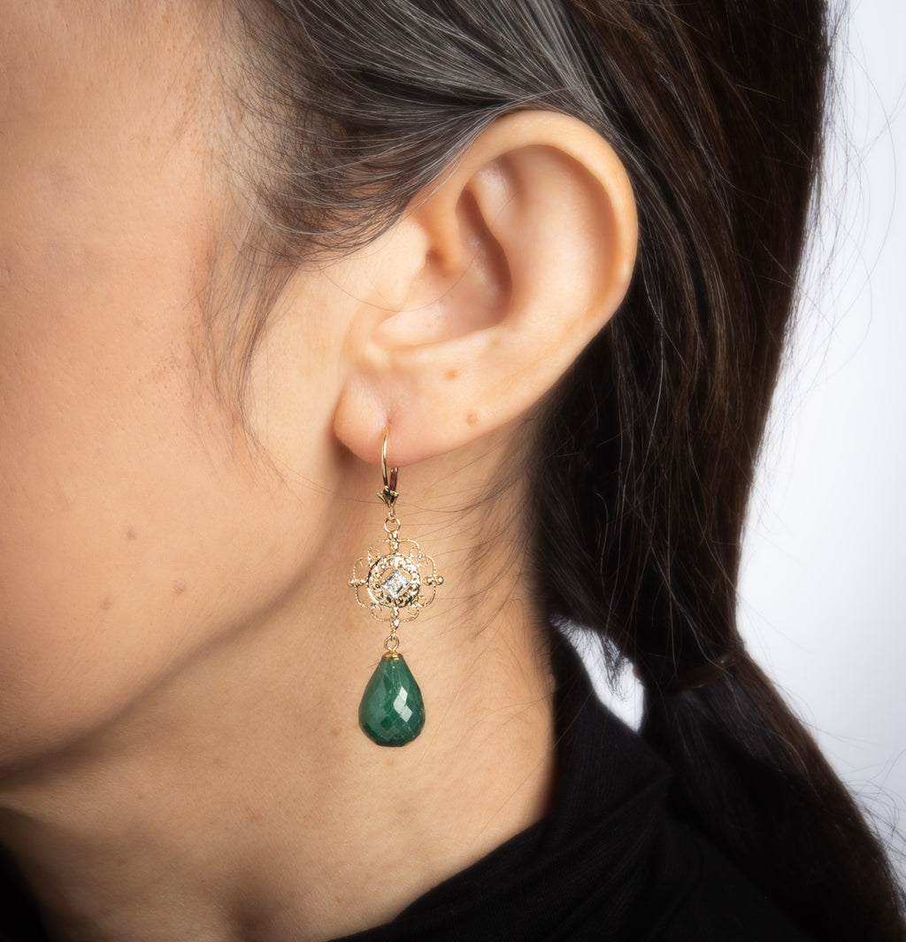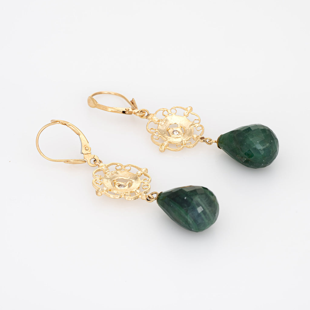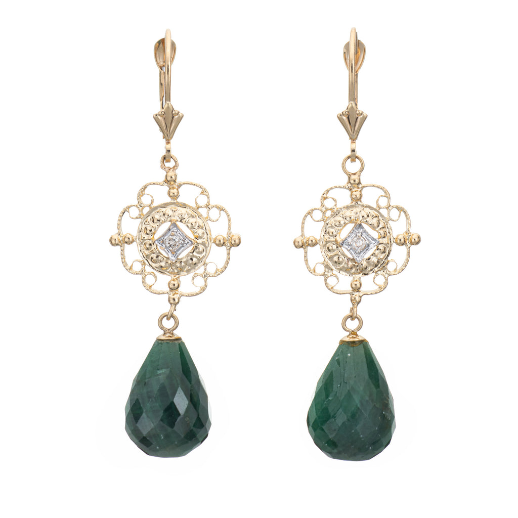 Elegant pair of vintage briolette faceted emerald & diamond earrings crafted in 14k yellow gold.