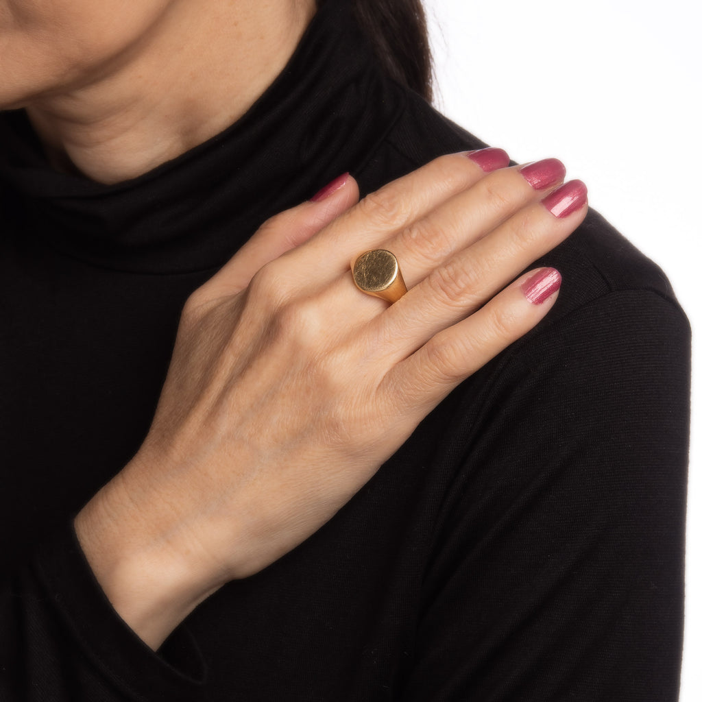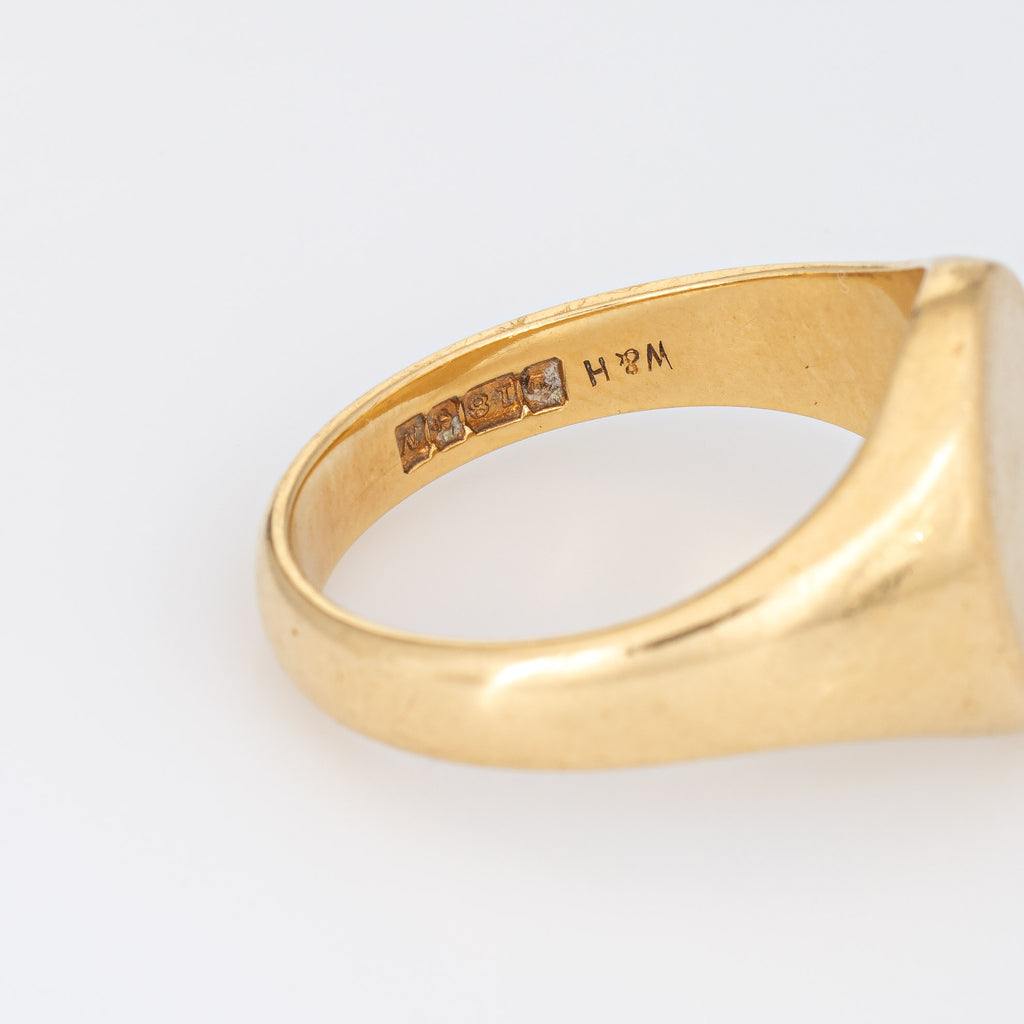 The oval signet has a weighty feel (11.7 grams) and sits flat on the finger (rises 2.5mm from the finger 0.09 inches). Crafted in buttery 18k yellow gold, the signet mount is currently unadorned and can be personalized if desired. The ring is stamped with English hallmarks (see below).