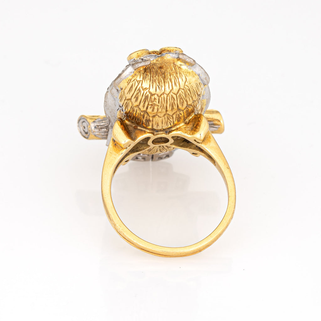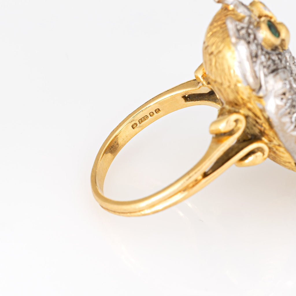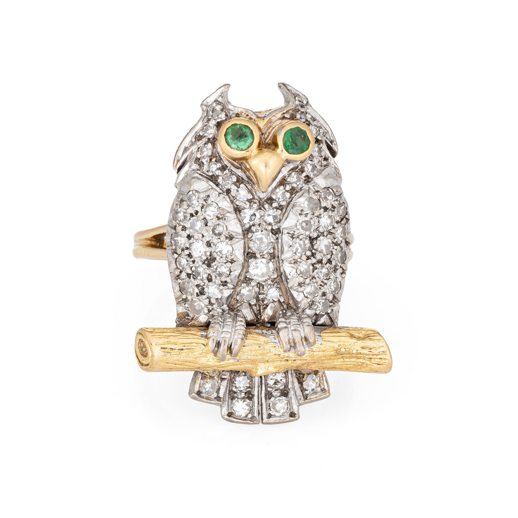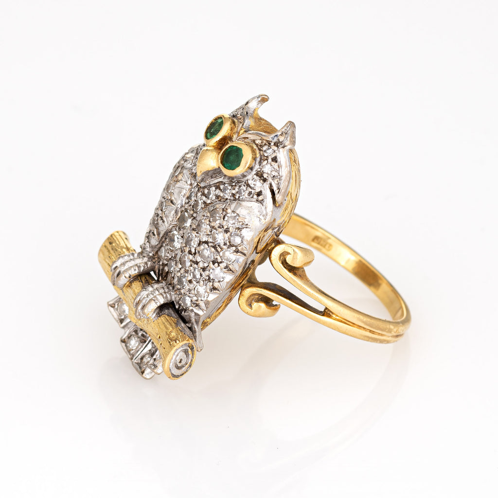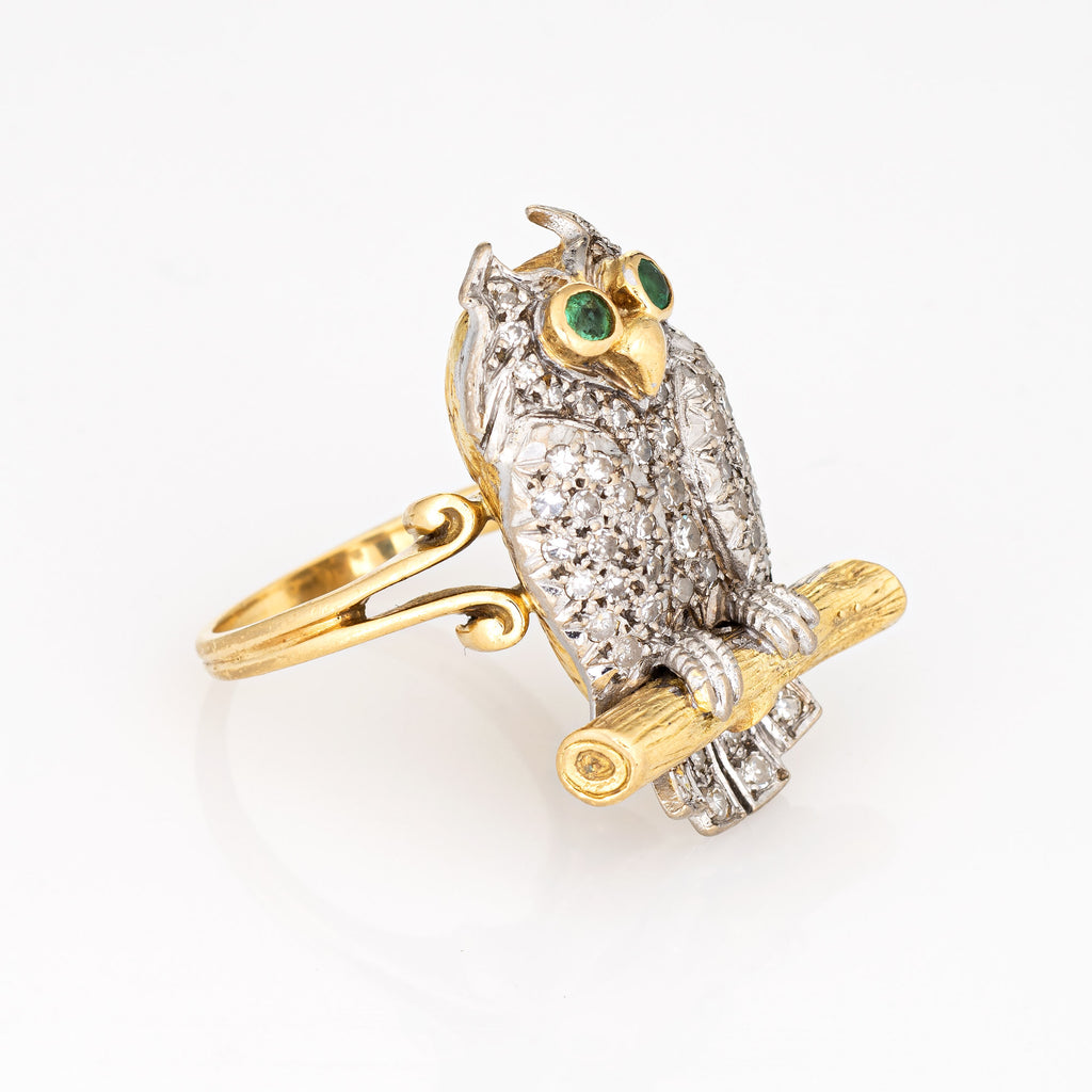 c1975 Vintage Owl Ring 18k Yellow Gold Diamond Emerald Eyes Fine Jewelry Sz 6