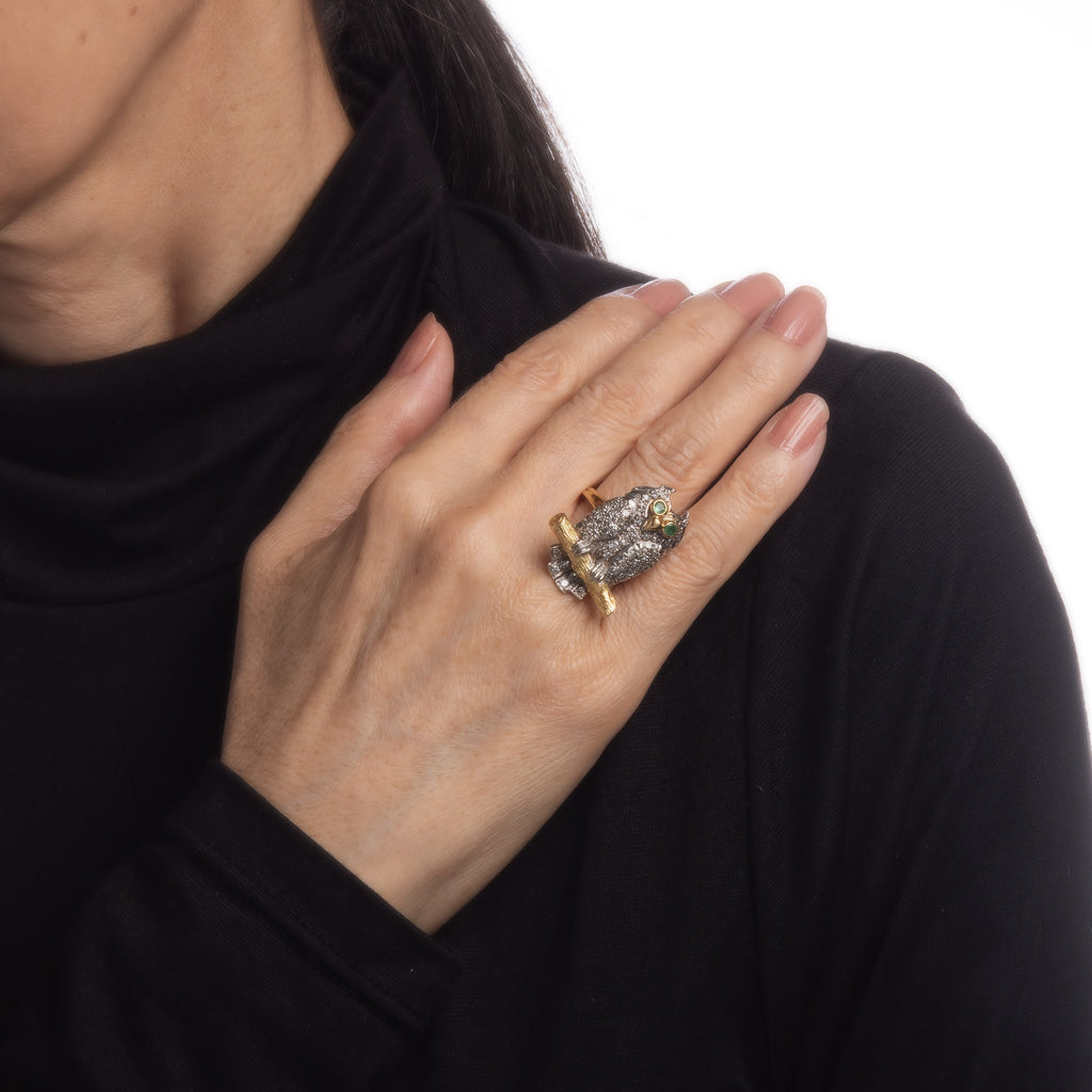 The beautifully detailed owl is set with diamonds to the body and emeralds to the eyes. The owl is perched on a branch with a commanding pose. A unique and finely detailed owl ring with English hallmarks. Owls are a symbol of wisdom and endurance. The medium rise ring (12mm - 0.47 inches) sits comfortably on the finger.
