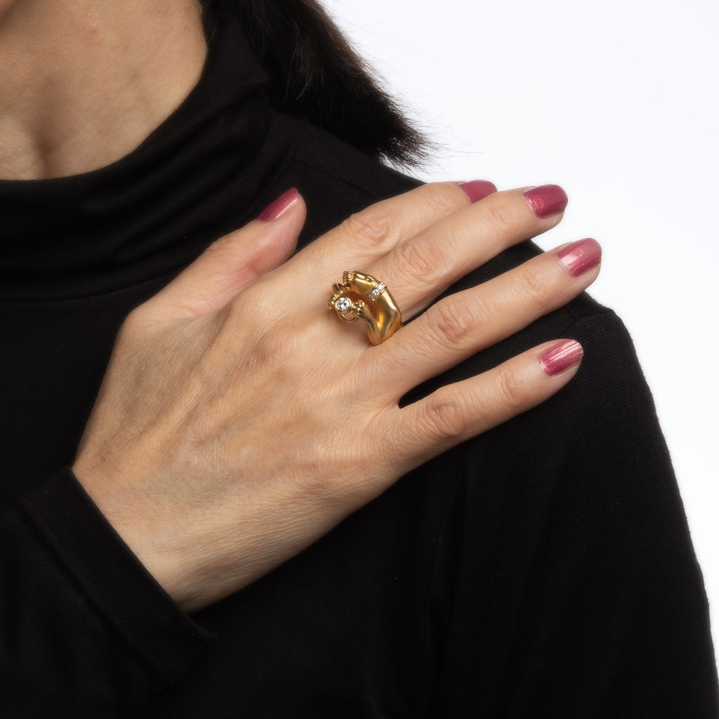 The charming ring by Carrera y Carrera highlights the beautiful sculptural designs the Spanish jewelry house is known for, with inspiration from nature and mythology. The panther features a matte gold finish with diamonds set to the collar and a larger diamonds cradled by the cats paws. The ring has a low profile and rises 7mm from the finger (0.27 inches).