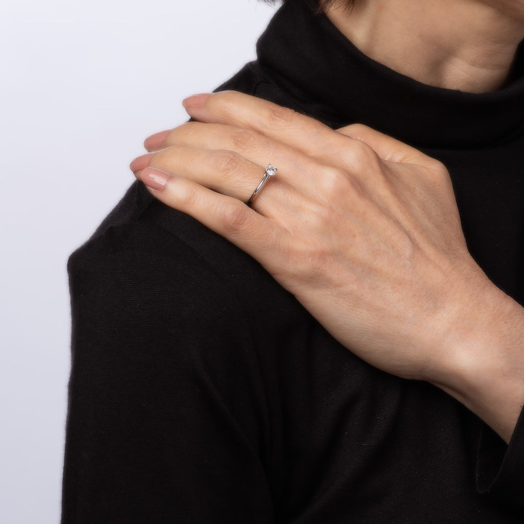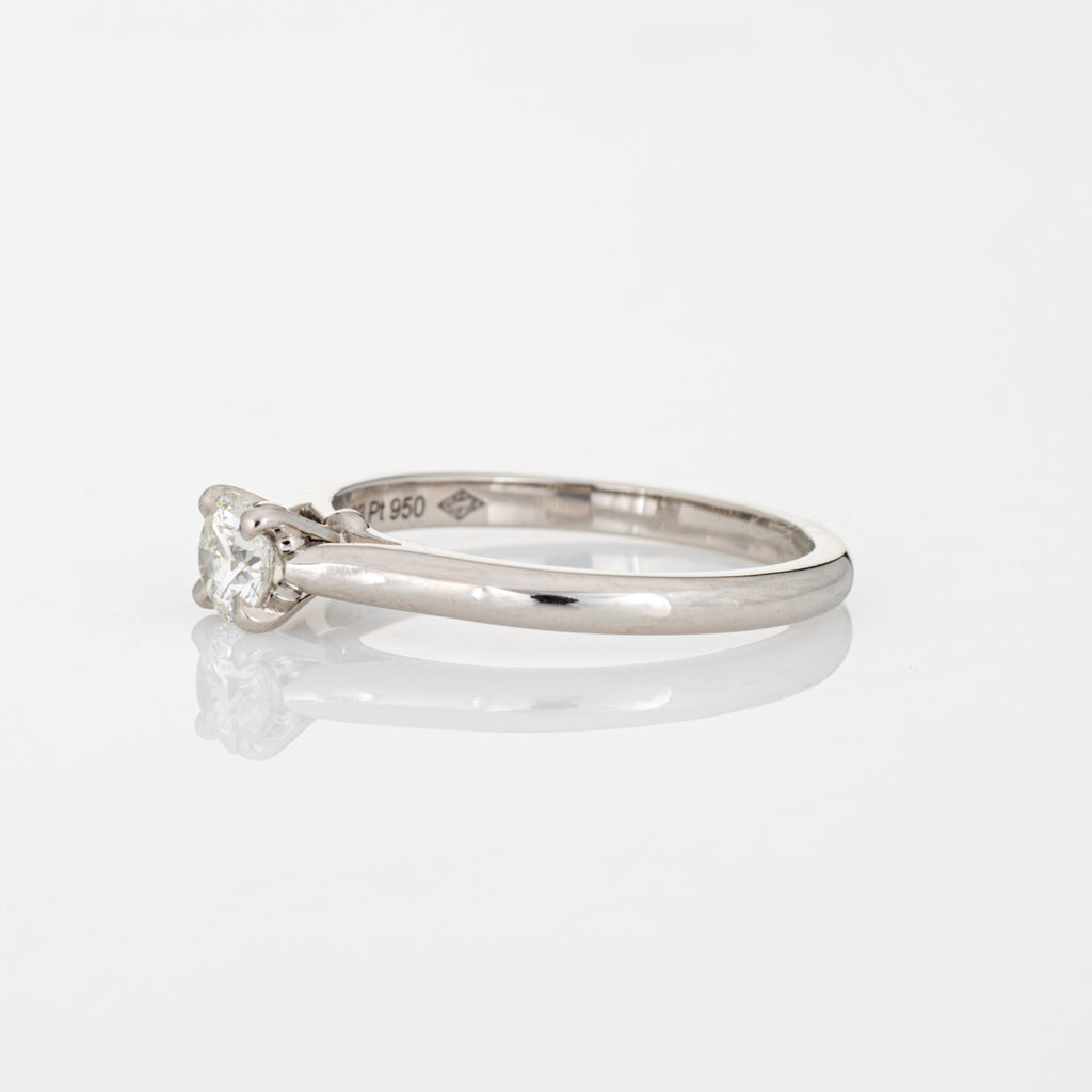 The ring is set with a 0.30 carat round brilliant cut diamond (H color and VS1 clarity).