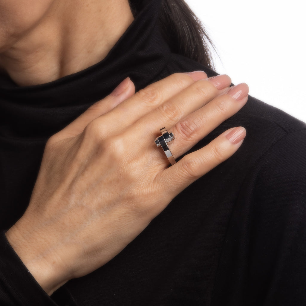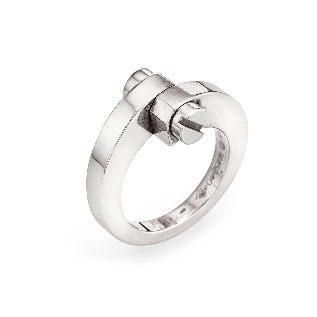 The iconic Cartier ring features a bypass design, terminating with two screw head motifs. The ring is great worn alone or layered with your fine jewelry from any era. No longer made by Cartier, the timeless Menotte design is great for everyday wear.