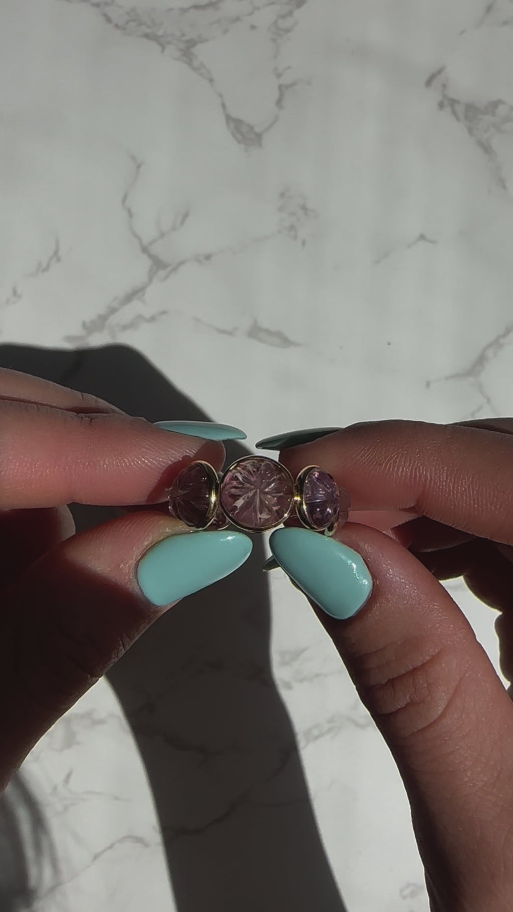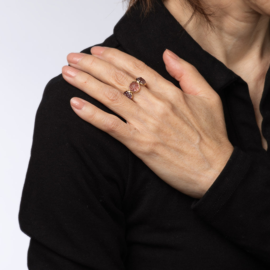 Carved in the form of a flower in various shades of pink, the eternity band is ideal worn alone or stacked. The low rise ring (5.5mm - 0.21 inches) sits comfortably on the finger. An 8/10 on the Mohs hardness scale, spinel's are a durable gem and great for daily wear.