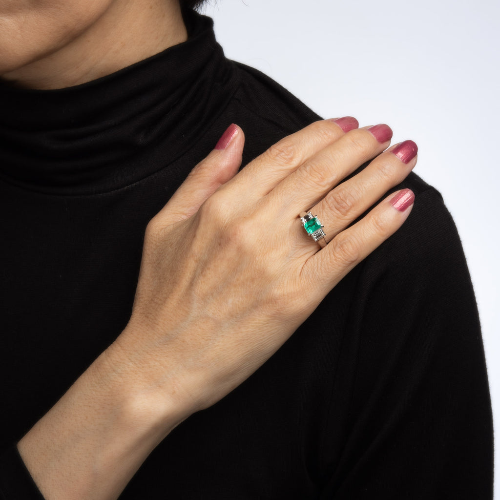 Stones: Emerald cut natural; emerald is estimated at 0.90 carats (6.47 x 5.12 x 3.74mm), medium green color, moderately included, good cut, Columbian origin, moderate clarity enhancement, good cut. The emerald is in very good condition and free of cracks or chips.
