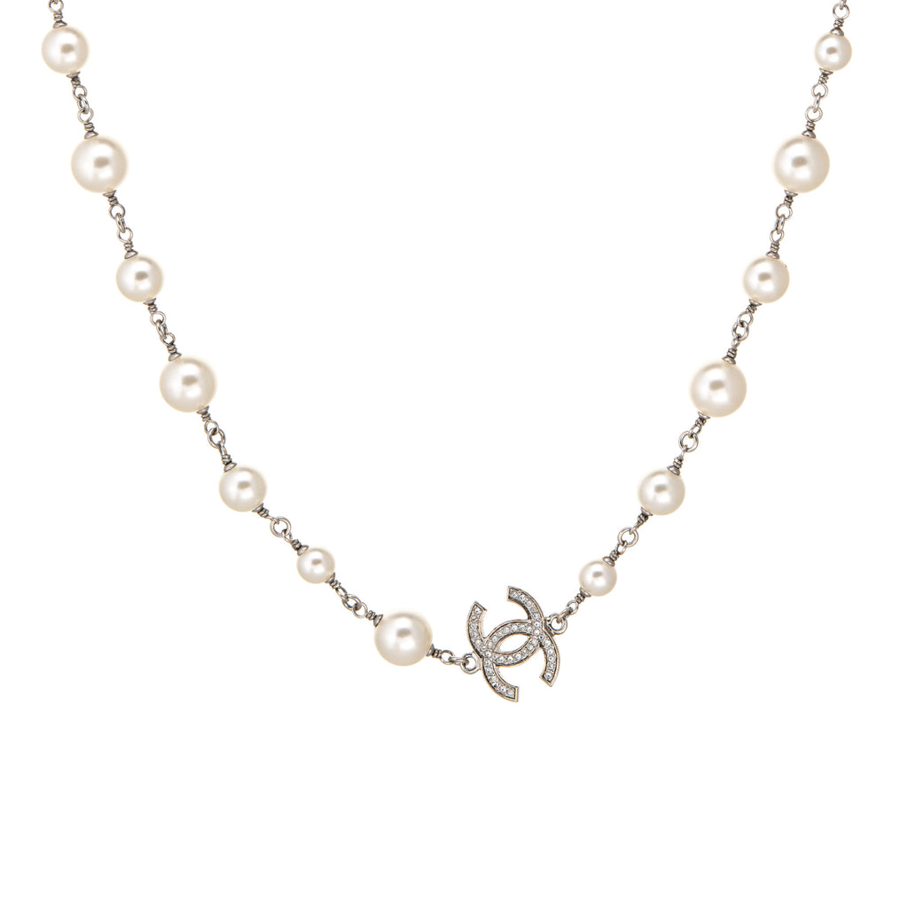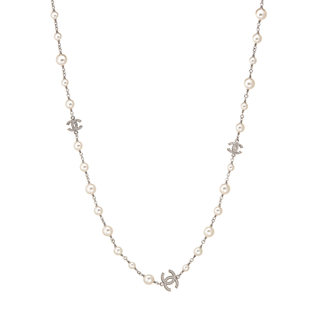 The necklace features graduated 8mm to 12mm faux white pearls. Five crystal set CC logos separate the beads (the crystals are set on both sides of the CC logo). The necklace can be worn as a long 42 inch chain or wrapped as a double strand necklace.