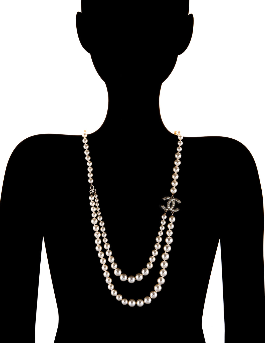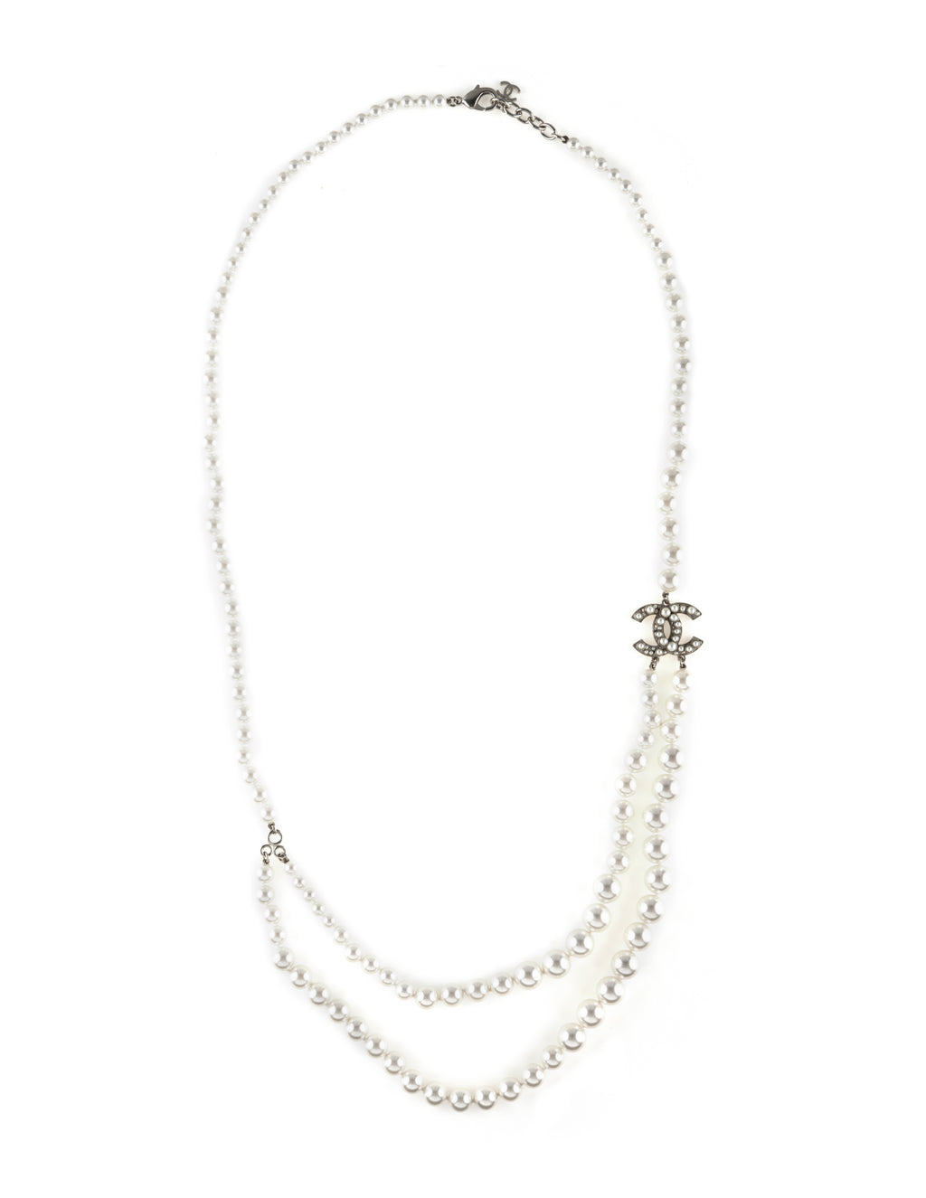 Stones: Faux pearls graduate in size from 6mm to 12mm. Smaller 1mm to 3mm faux pearls are set into the CC logos. The pearls are individually knotted for added security.