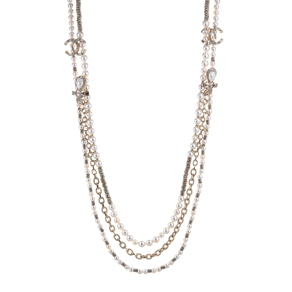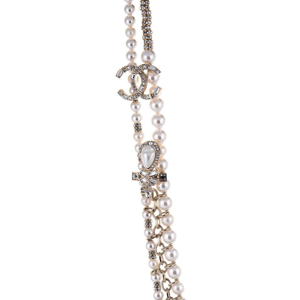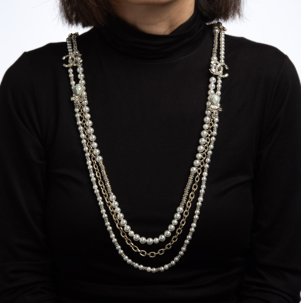 The necklace features graduated 6mm to 8mm faux white pearls, separated with crystal-embellished stations. Two CC logos and four cross motifs adorn the necklace. The necklace can be worn as a long 40-inch chain or wrapped as a double-strand necklace. Also great for wear as a belt. The elaborate necklace is embellished with many crystals, offering plenty of sparkle and shimmer with every movement.