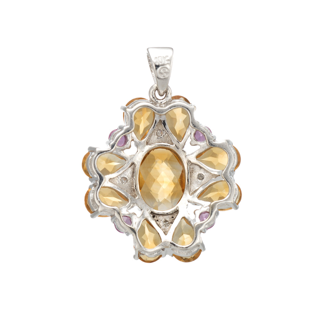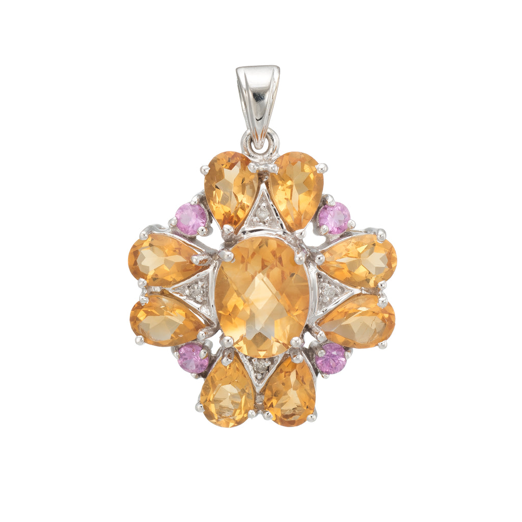 Finely detailed estate pendant set with citrine, pink tourmaline & diamonds crafted in 10k white gold.