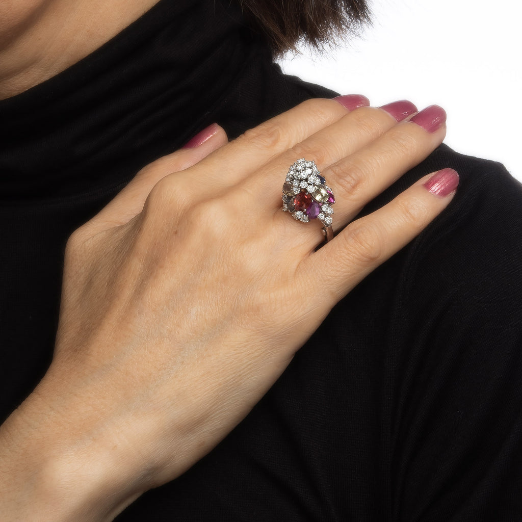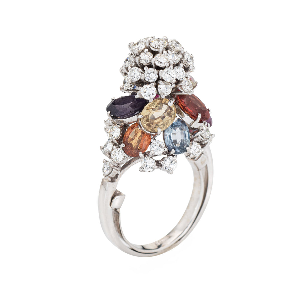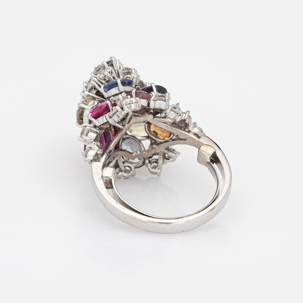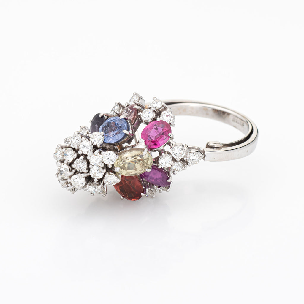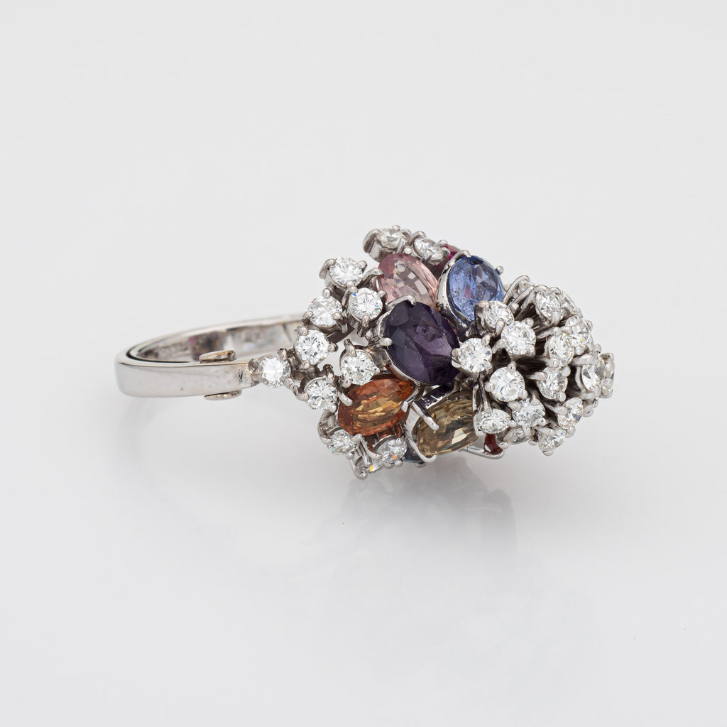 Distinct & unique 'snow cone' ring set with colored sapphires & diamonds (circa 1960s to 1970s) crafted in 18 karat white gold.