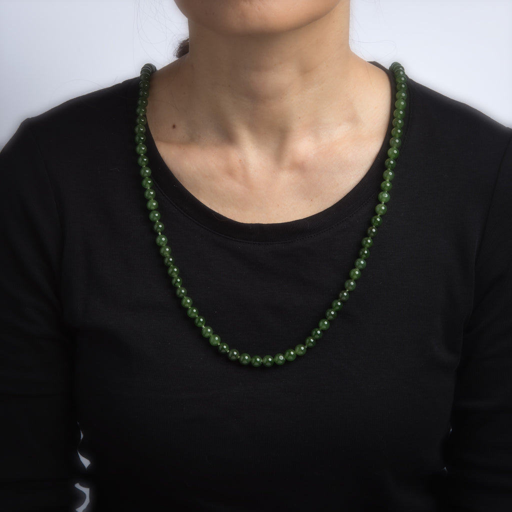 The stylish necklace measures a long 34.5 inches and can be worn as a long single strand or wrapped as a double strand choker. The jade beads are cold to the touch and a darker spinach green color.