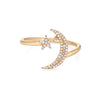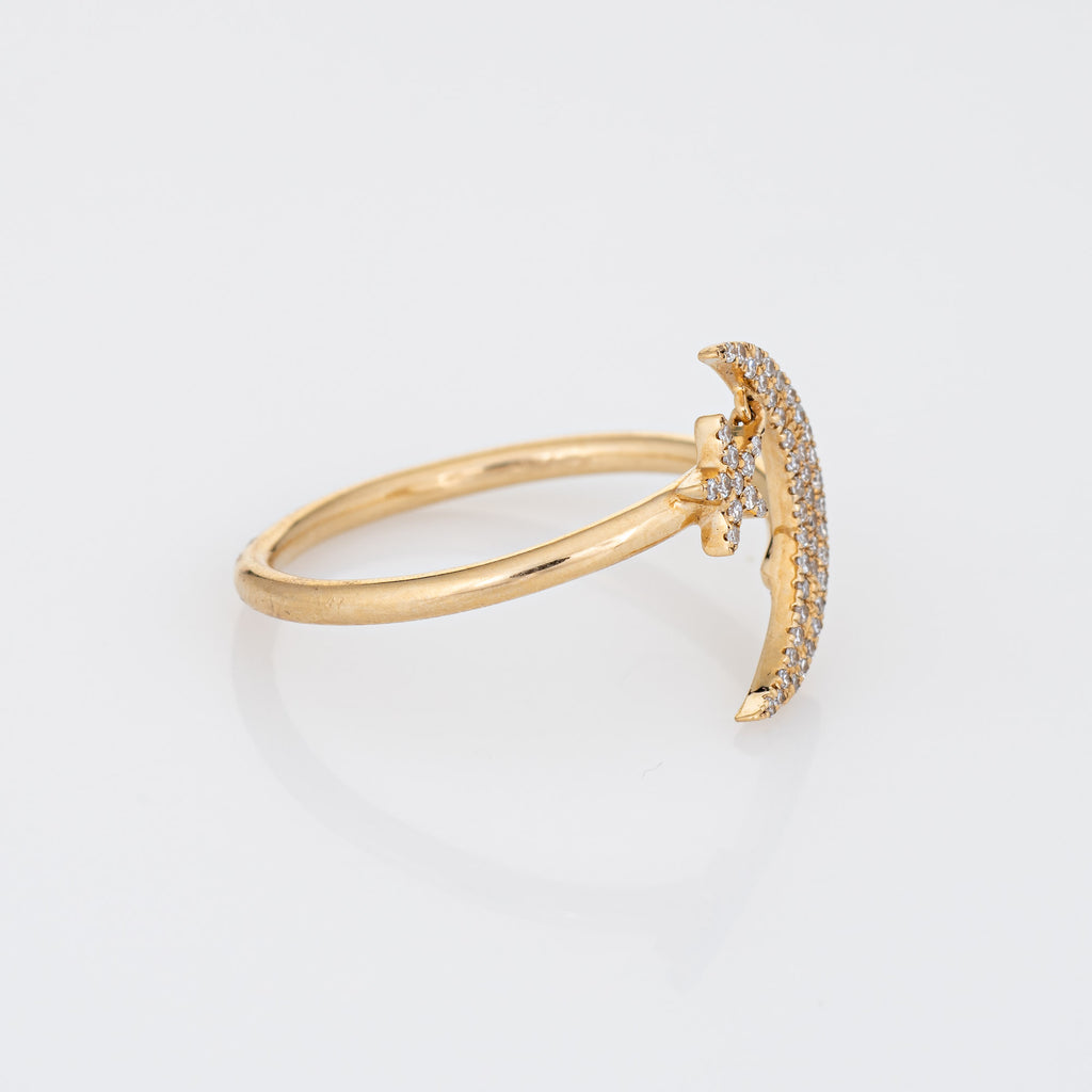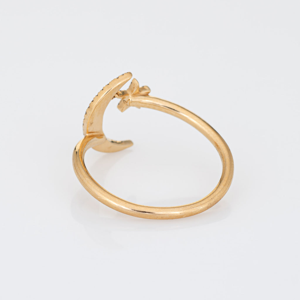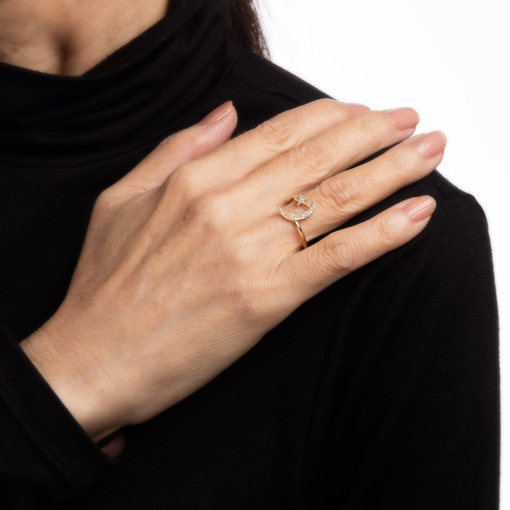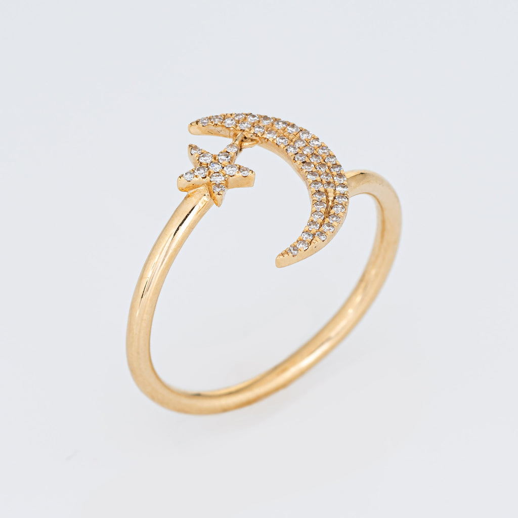 Stylish crescent moon and star diamond ring crafted in 14 karat yellow gold.