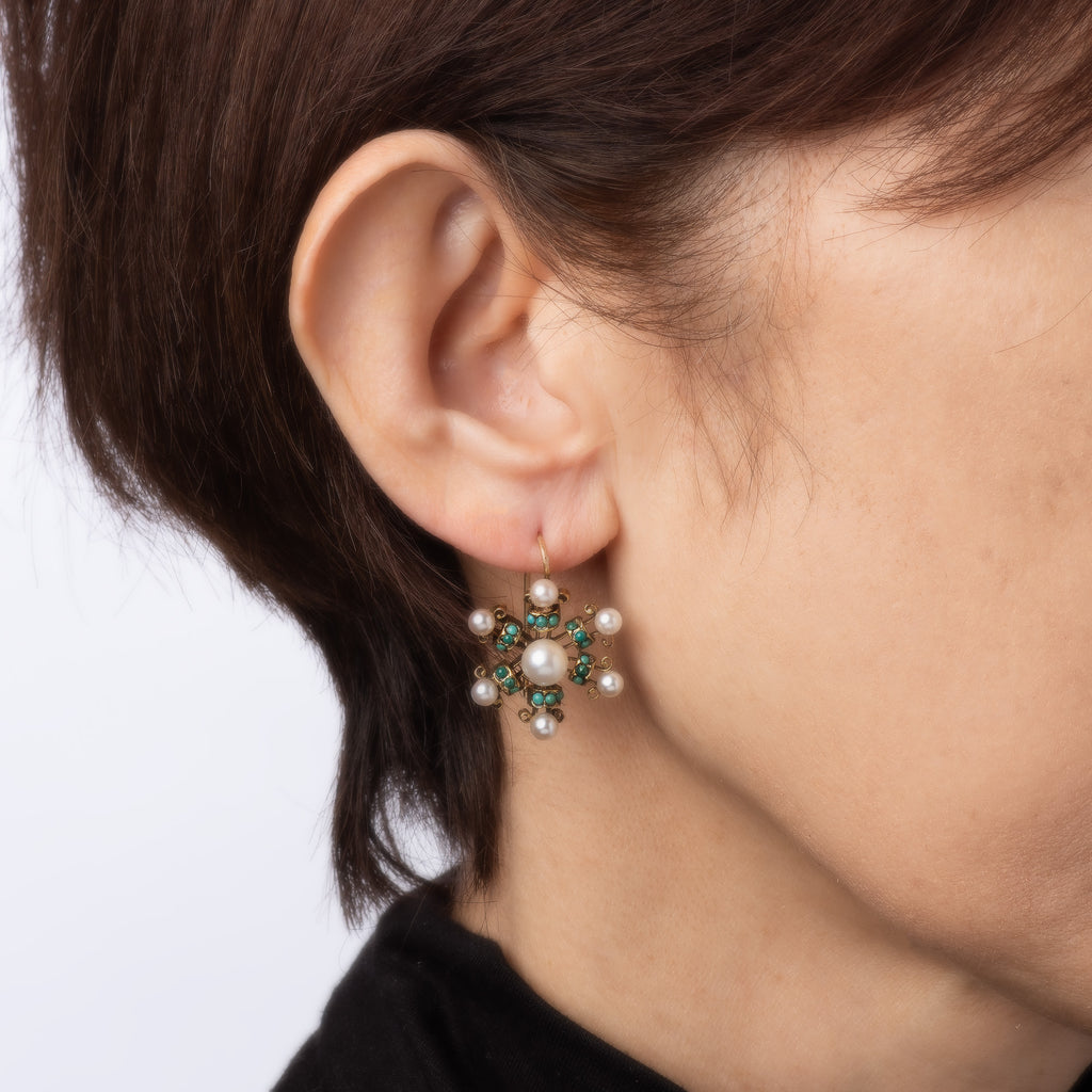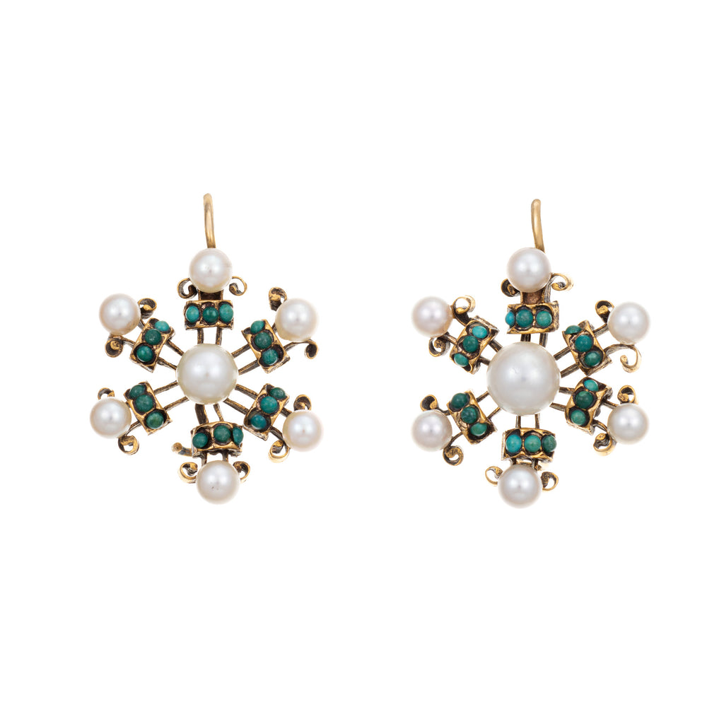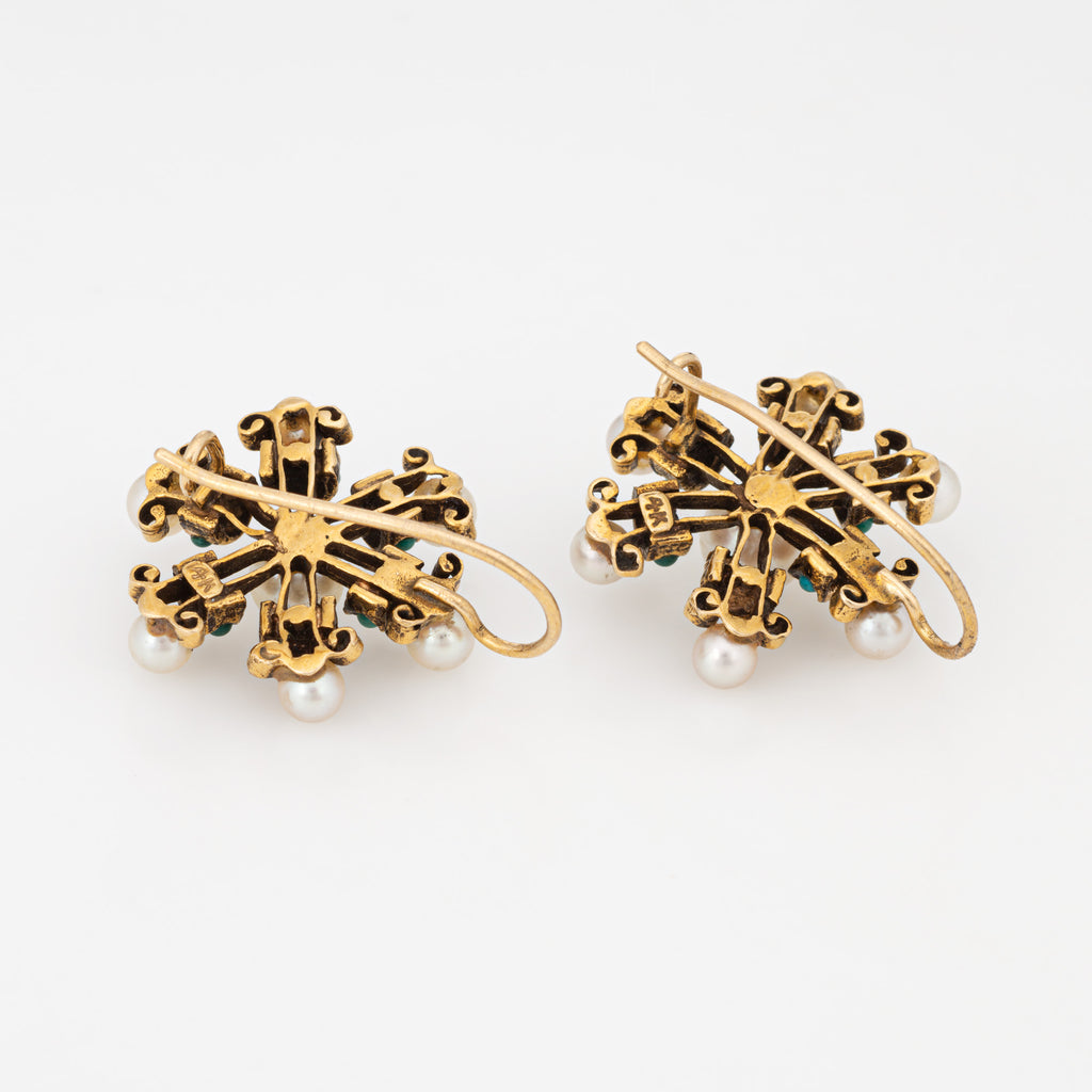 Finely detailed pair of vintage cultured pearl & turquoise snowflake earrings crafted in 14k yellow gold (circa 1960s).