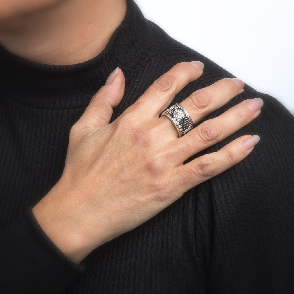 Black and white diamonds total an estimated 1.30 carats (the black diamonds total an estimated 1.20 carats and the white diamonds total an estimated 0.30 carats - estimated at H color and SI1 clarity).