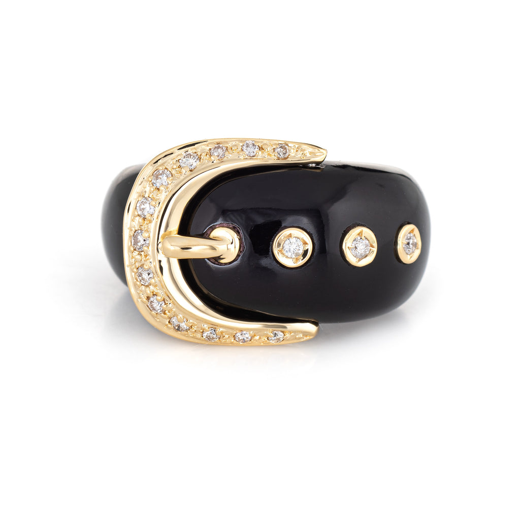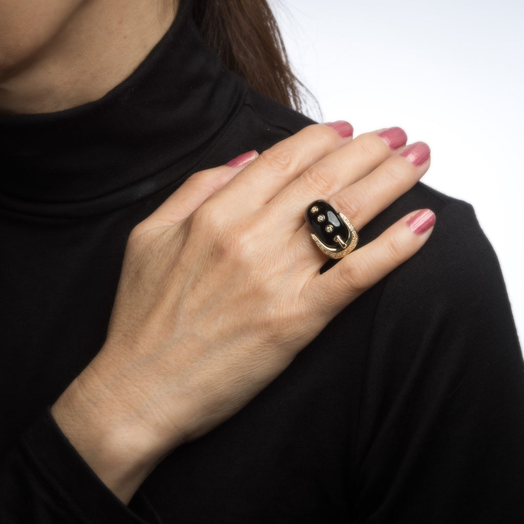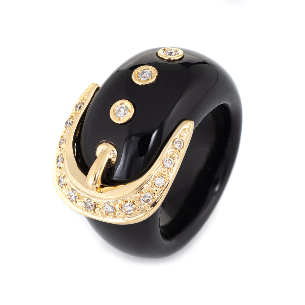 Stylish black resin diamond buckle ring crafted in 18 karat yellow gold.